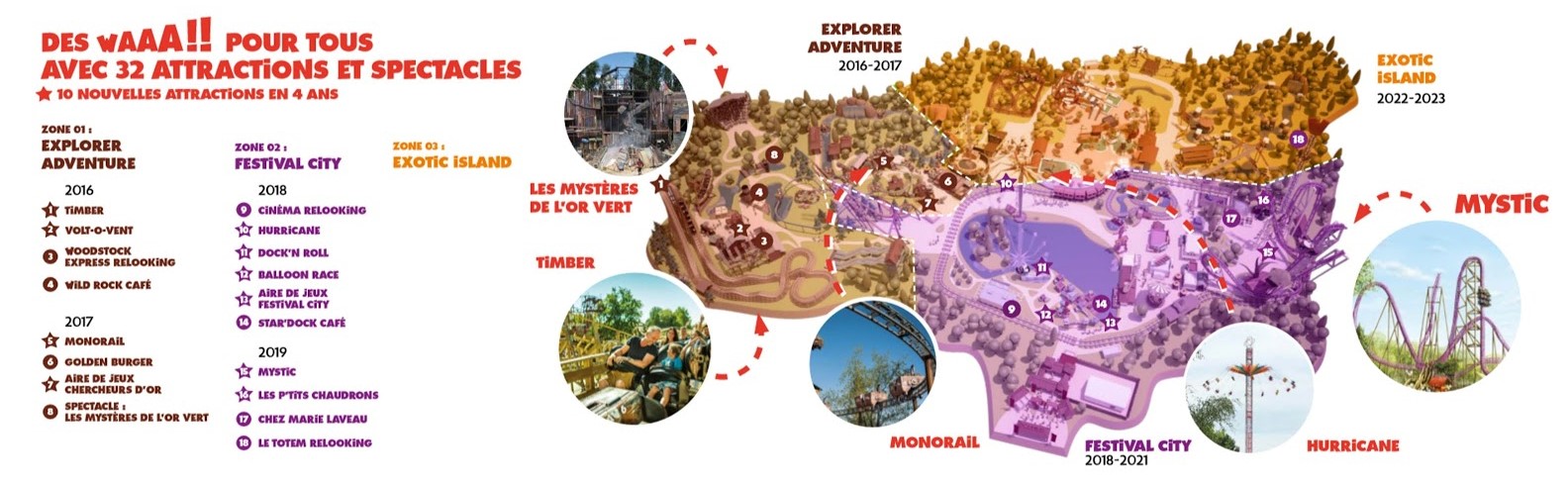 En Novembre 2015, Walibi Rhône-Alpes annonçait un plan d’investissements historique : ce n’est en effet de pas moins de 47 millions d’euros qui seront injectés dans le parc entre 2016 et 2025. Au programme, de nombreuses nouvelles attractions, de nouveaux restaurants et le développement de trois zones thématiques (Explorer Adventure, Festival City et Exotic Island), abandonnant définitivement le thème unique issu du rebranding de 2011 qui n’avait jamais vraiment séduit le public. Avec ces investissements, Walibi Rhône-Alpes compte bien attirer les visiteurs sur son site et se repositionner en tant que parc régional, mais aussi national.