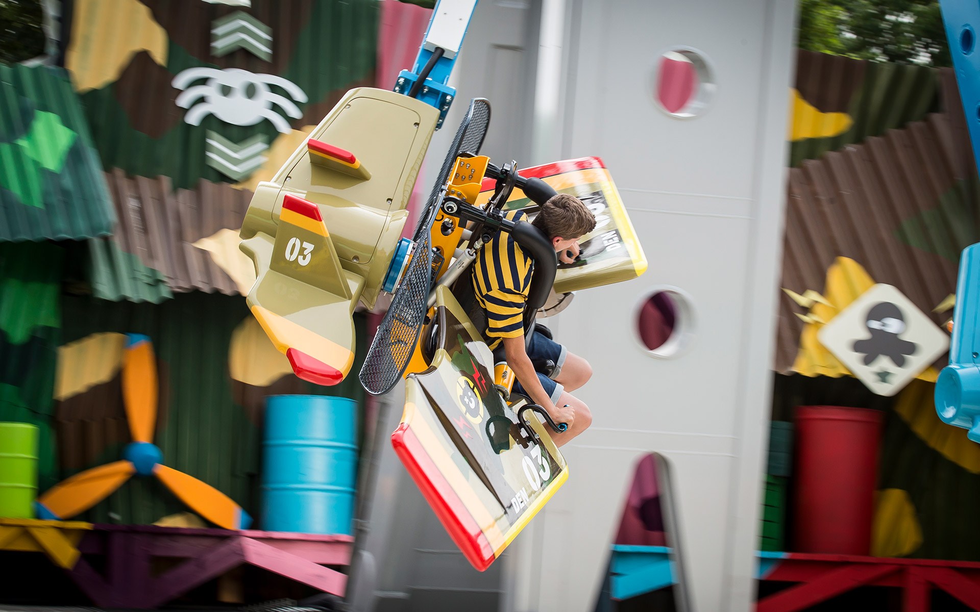 Avec Squadron 33, le parc vous propose depuis le 19 Mai 2018 de prendre les commandes d’un petit avion de chasse et de le faire virevolter à votre guise : vous pouvez en effet profiter de quelques tours paisibles ou enchainer les vrilles et les loopings ! Cette attraction de type Aerobat du constructeur italien Technical Park permet une prise en main individualisée de chaque nacelle par le visiteur qui en est le (presque) seul maître, ce qui a pour avantage de séduire un plus grand nombre de visiteurs (qui pourraient être effrayés par une attraction avec des inversions incontrôlées), mais aussi une interaction garantie et… une variété des cycles !