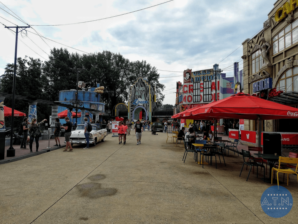 Cette zone d’entrée relookée est un patchwork de couleurs, de matières et de textures, s’inspirant des styles urbains de diverses grandes villes telles que Londres, New York et Tokyo, mais aussi et surtout de festivals. Celle-ci se compose de plusieurs points horeca, comme The Bakkery, proposant des muffins, cookies, croissants, glaces et frites, American Café, un Sports Bar spécialisé dans les cafés et la bière, Candy and Cream, un magasin de bonbons et de crèmes glacées à composer soi-même, mais aussi d’une boutique souvenirs, Sunset Shop, et d’un bureau d’information, Guest Service.