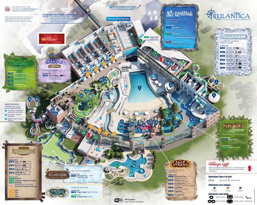 Construit sur un terrain de 45 hectares au sud du parc mécanique Europa-Park, Rulantica s’étend sur 32.600 m², se compose de neuf zones thématiques et propose vingt-cinq attractions, dont dix-sept toboggans, une zone extérieure ouverte de Mai à Septembre, une piscine à vagues, une rivière sauvage et une Lazy River (canal artificiel dans lequel est recréé un faible courant simulant celui d’une rivière calme) de 250 mètres.