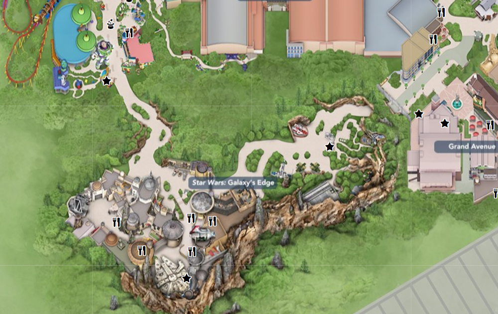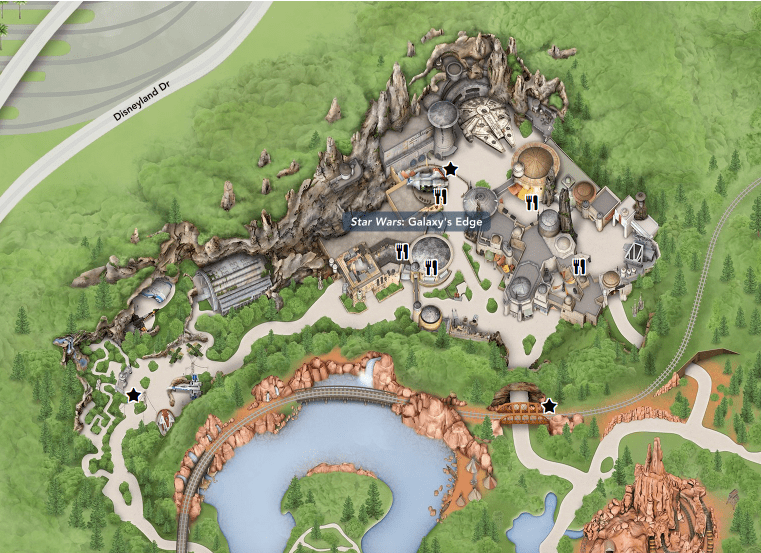 La zone Star Wars: Galaxy’s Edge du Disneyland Park (Anaheim), qui est ouverte depuis le 31 Mai 2019, représente un investissement d’un milliard de dollars et s’étend sur 5,5 hectares. Elle est localisée au Nord de Frontierland, dans le parc principal du Resort (alors qu’elle est ou sera inaugurée dans les parcs secondaires à Orlando et à Paris). Elle se situe au niveau de l’ancien Big Thunder Ranch et d’une zone de backstages qui contenaient un entrepôt et des bureaux. Ces derniers ont quant à eux été déplacés sur un terrain récemment acquis par le Resort.