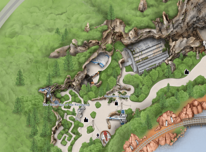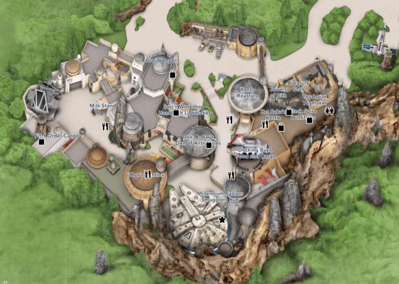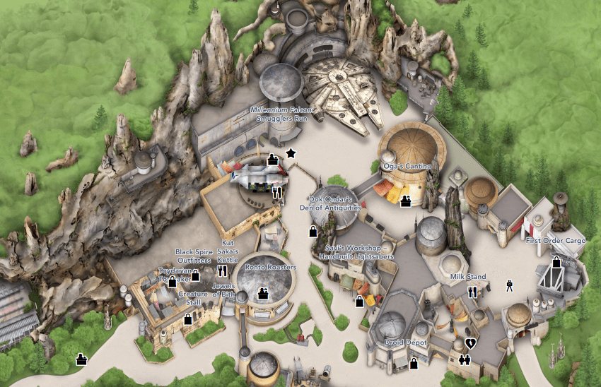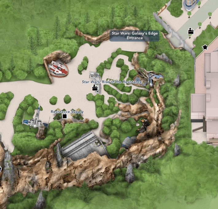Le land se positionne après les événements du 8ème volet de la saga : Les Derniers Jedi, sorti en 2017. Il est divisé en deux parties, l’une étant l’avant-poste Black Spire (Black Spire Outpost) et l’autre le repère des rebelles (The Resistance Hideout). L’avant-poste contient une attraction, sept boutiques et cinq points de restauration. Le repère de la Résistance contient lui une attraction et une boutique souvenirs.