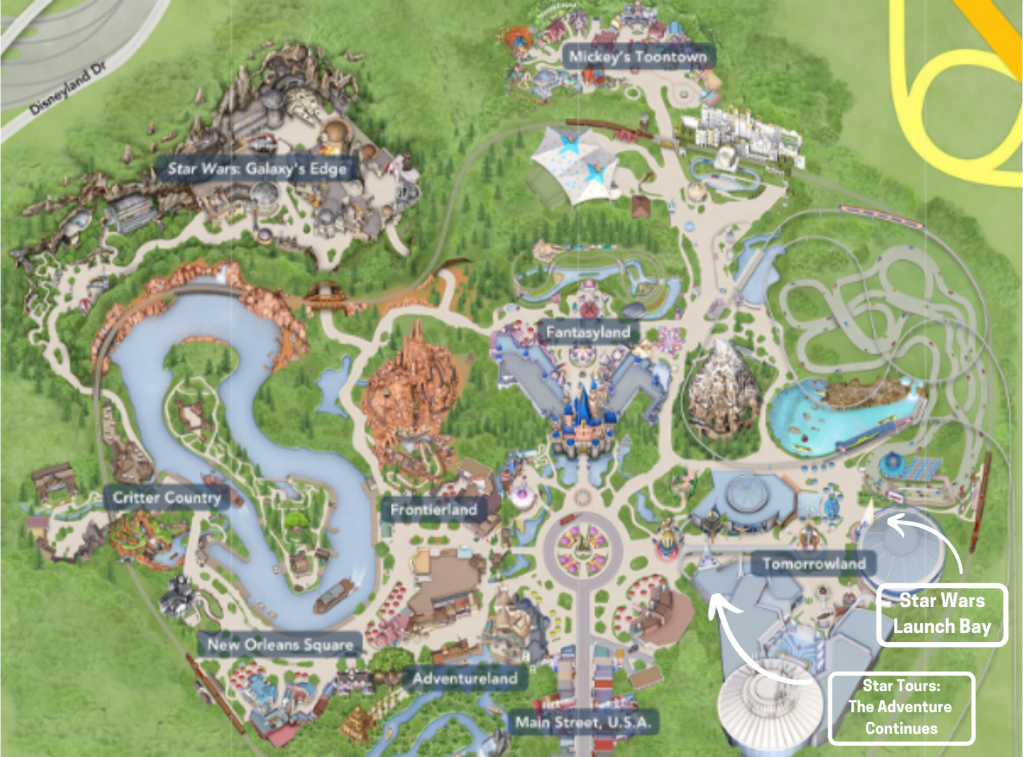 - Star Tours: The Adventure Continues : un simulateur de vol en 3D similaire à ceux présents dans les parcs Disneyland Park (Paris), Tokyo Disneyland et Disney’s Hollywood Studios.