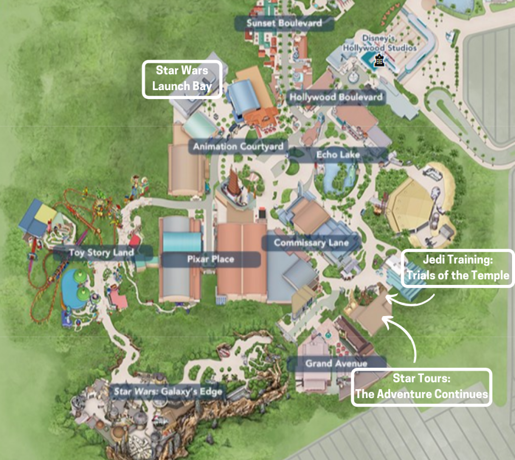 - Star Wars Launch Bay : un bâtiment qui abrite une exposition d’objets ayant servi dans la production des films. Vous pouvez également visionner un documentaire de 10 minutes qui suit les personnes qui sont derrière la réalisation des films de la saga : The Stars Behind Star Wars. Enfin, 3 points de rencontre sont proposés avec des personnages des films : Dark Vador, BB-8 et Chewbacca.