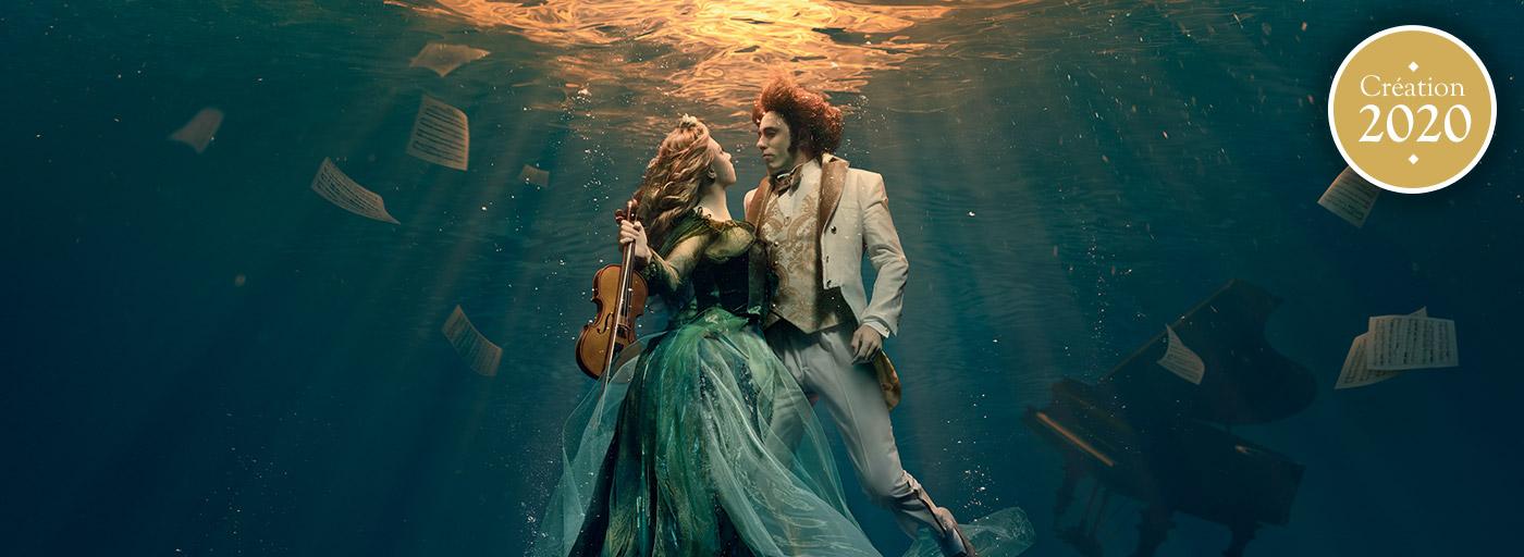 « Chaque soir, à la tombée de la nuit, une douce mélodie résonne sur le lac et réveille peu à peu le souvenir du plus romantique des mariages. La Muse violoniste et le Pianiste virtuose se retrouvent pour célébrer leur amour éternel dans une féérie d’eau et de feu. »