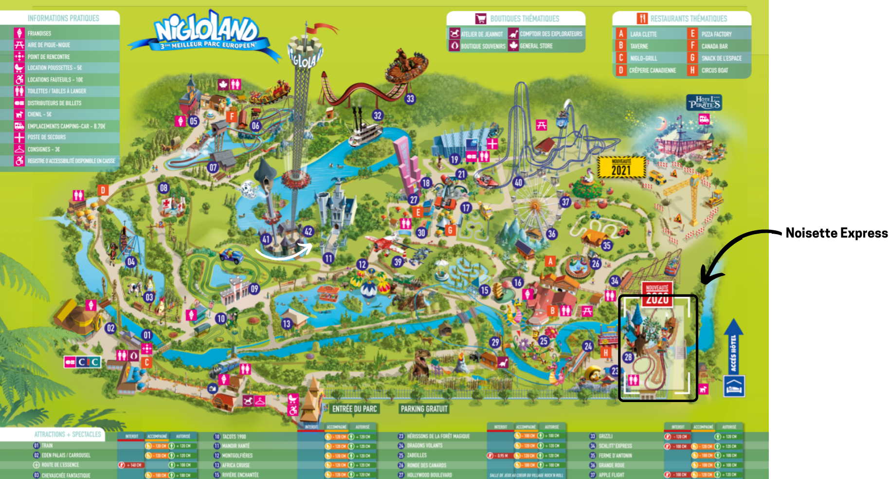Le parc aubois a accueilli en 2020 un grand-huit familial, nommé Noisette Express, afin d’étoffer son offre de coasters à sensations tout en restant accessible au plus grand nombre. Il vient rejoindre le Village Merveilleux suivant la nouveauté 2018 de Nigloland, Zabeilles, en continuant sur la même thématisation.
