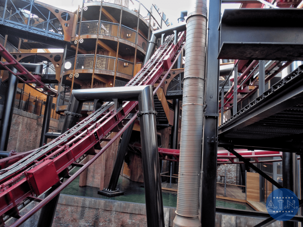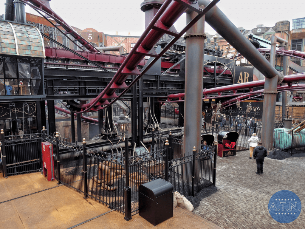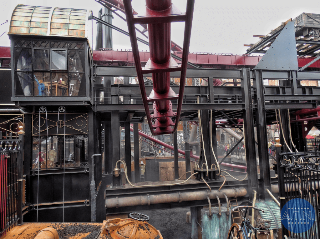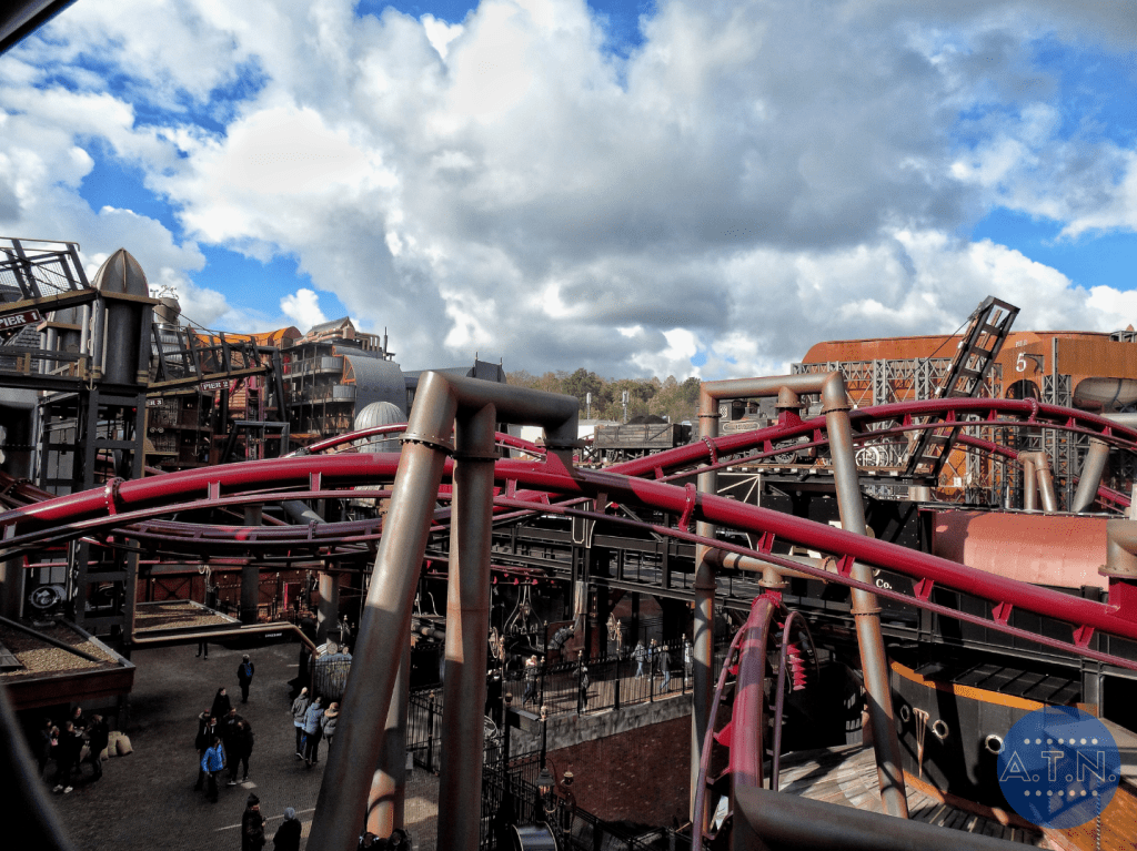 Durant la file d’attente, vous vous baladerez au sein de Rookburgh, admirant toute la zone grâce à des passerelles en hauteur et des endroits cachés. L’embarquement est très spécial car il vous faudra tout d’abord mettre toutes vos affaires dans des casiers pour éviter la chute de quoi que ce soit (vous passerez même sous un portique de sécurité, comme dans un aéroport) puis vous vous assiérez sur des sièges déplacés sur le côté des rails. En effet, les rails sont tournés dans votre direction lors de l’embarquement afin de faciliter votre installation et c’est après le pre-show que le rail se tourneront et que vous vous retrouverez en position allongée.