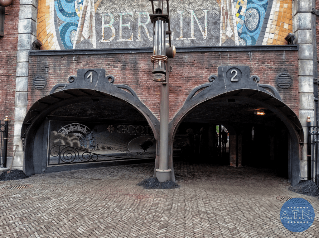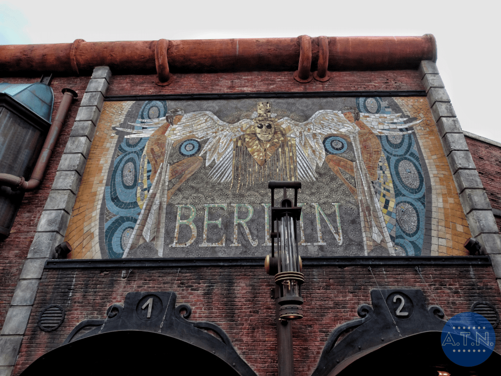 Du côté de Berlin, l’entrée se situe dans la rue principale. Les visiteurs passent par un couloir ressemblant à une station de métro, agrémenté de posters publicitaires et de décorations. La façade par laquelle ils débouchent expose une mosaïque portant le nom de Berlin.
