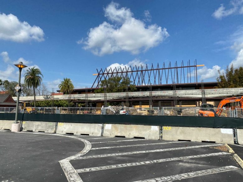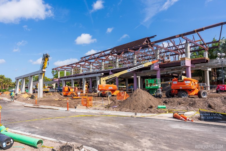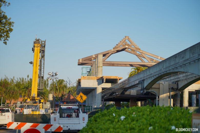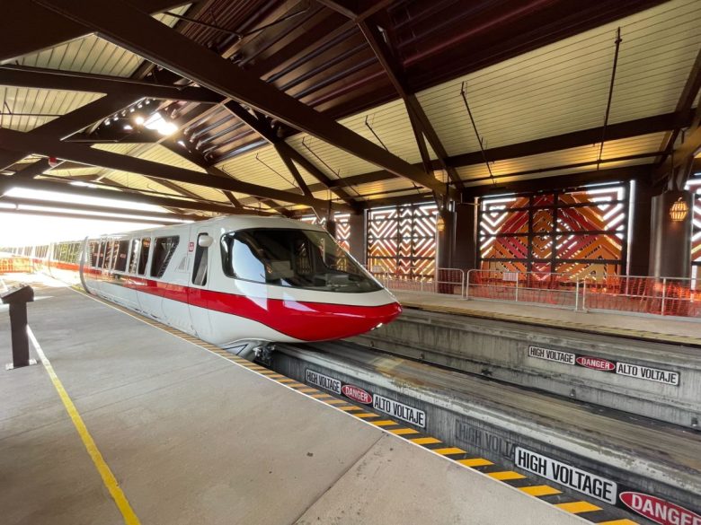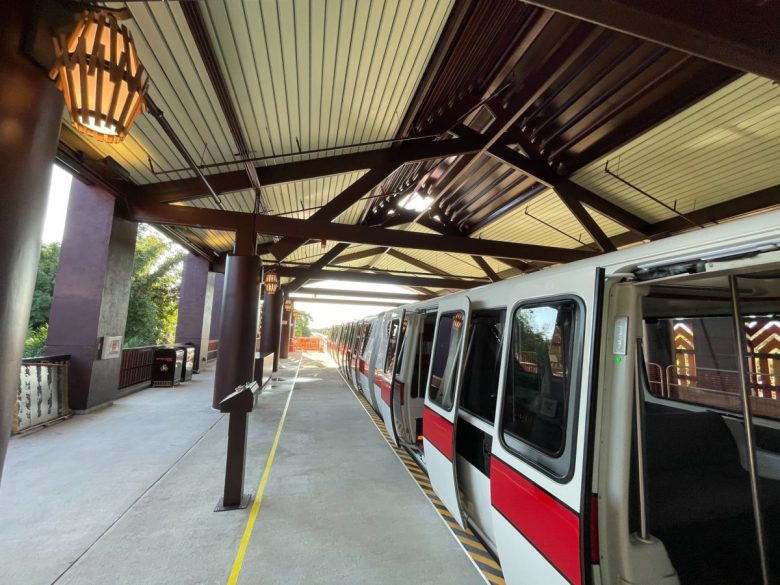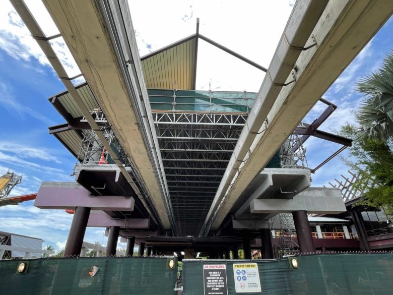 Vous pouvez observer ci-dessous la façade de l’hôtel qui a été entièrement reconstruite, incluant le remaniement du design de l’entrée (avec une porte cochère) ainsi que l’aménagement de la station de monorail. Cette dernière a rouvert le 5 Septembre 2021 et l’entrée, le 10 Septembre.