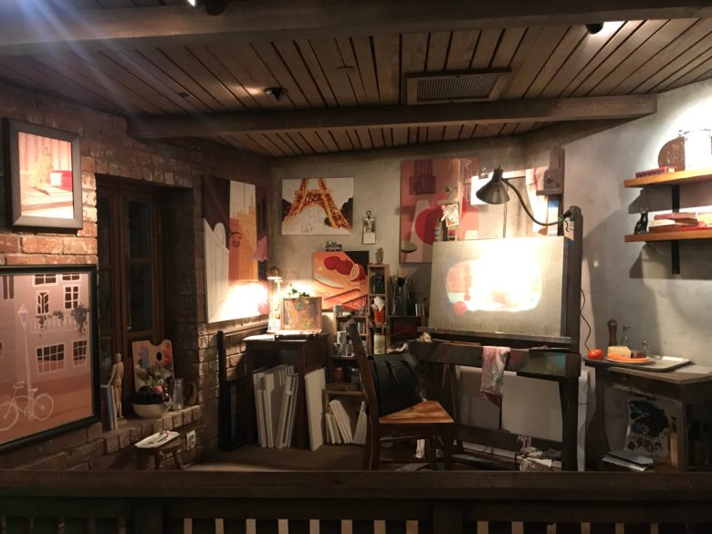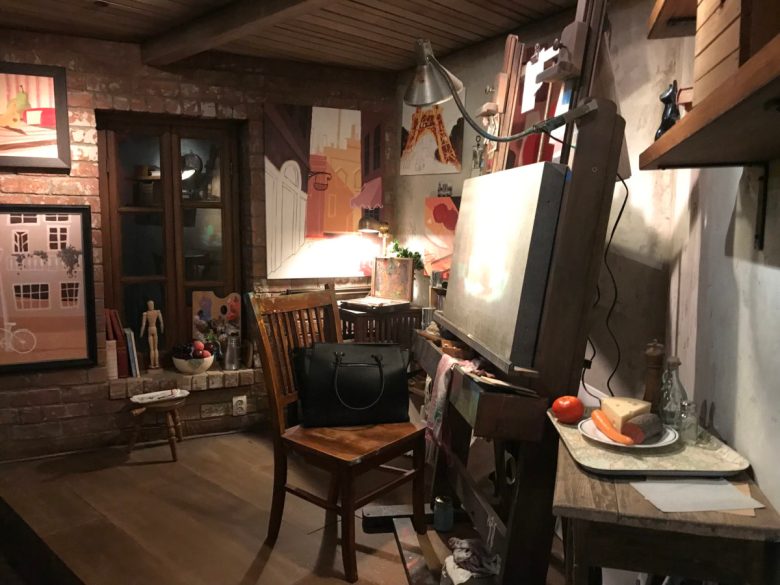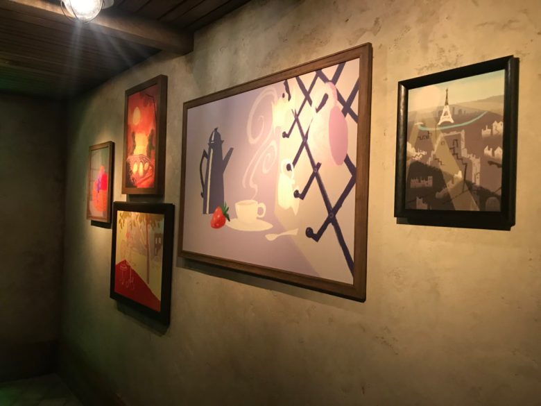 Concernant la file d’attente, on retrouve la salle sur les toits de Paris où Gusteau parle aux visiteurs en français et anglais mais également une seconde salle, reproduction d’un petit studio parisien d’artiste avec une toile sur laquelle défilent des indications pour embarquer dans l’attraction.