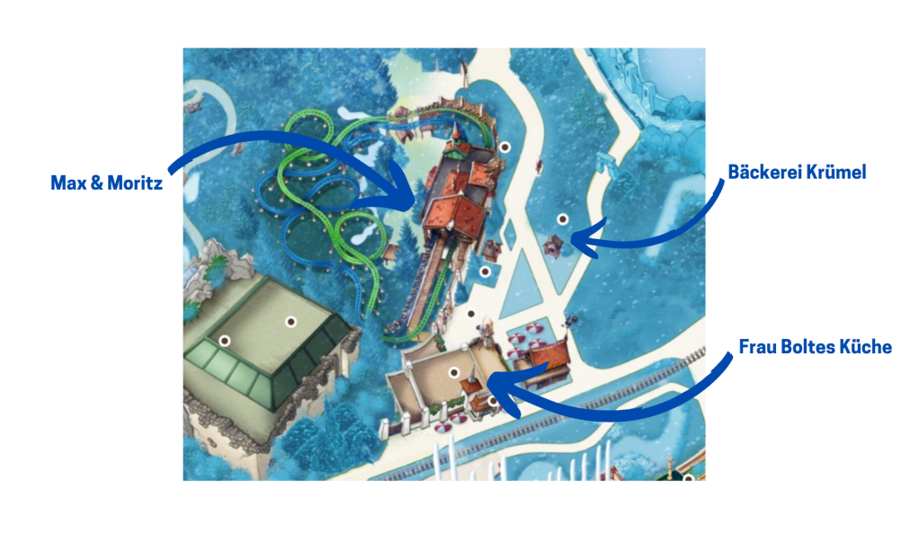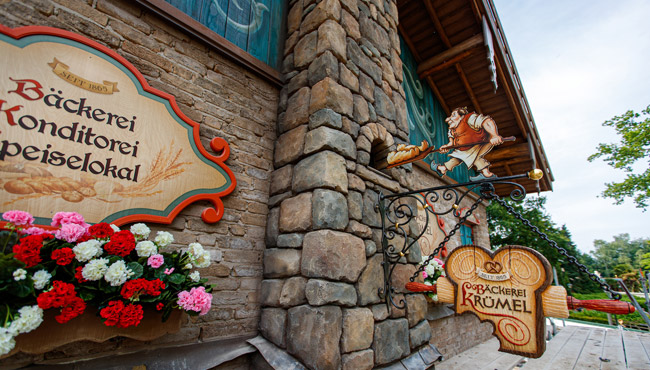 Bäckerei Krümel a donc été intégré à Max & Moritz Plein, la zone située autour de la nouvelle attraction 2020 et composée jusqu’alors de la double montagne russe familiale ainsi que du point horeca Frau Boltes Küche. Comme à son habitude, le parc ne s’est pas contenté de déposer un nouvel élément (ici une boulangerie), mais l’a intégré à l’histoire afin de garantir la cohérence globale des lieux : les deux garnements Max et Moritz (issus de la célèbre histoire de Wilhelm Busch datant de 1865), vivent dans un joli village avec leur mère Frau Schmetterling. Les garçons sont de véritables garnements et les villageois n’en peuvent plus de leurs farces ! Un soir, ils sont surpris par Krümel, le boulanger, alors qu’ils tentent de voler des biscuits dans son commerce… Le boulanger, en colère, les met alors dans le four !