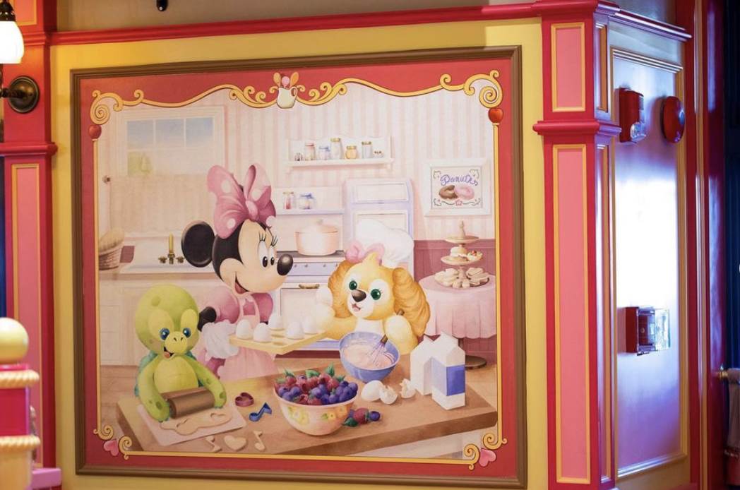 À l’intérieur, on peut y voir 4 fresques racontant un moment convivial entre Mickey et Minnie et Duffy et ses amis : ils ramassent des ingrédients, cuisinent un gâteau, le décorent et partagent un pique-nique.