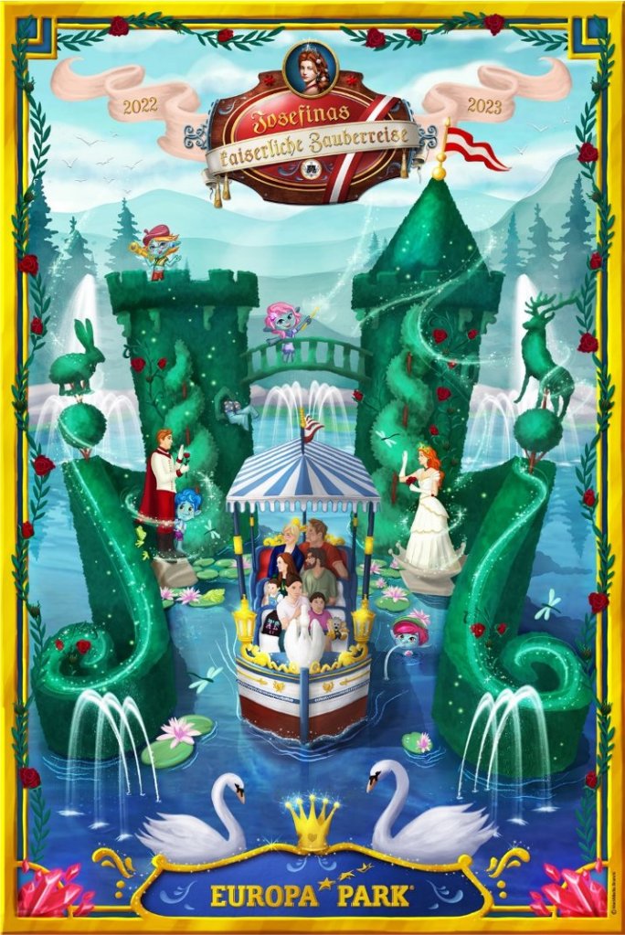 C’est donc l’une des plus anciennes aventures d’Europa-Park qui a été totalement repensée et qui a changé de thème, délaissant l’Afrique et ses représentations datées pour être rattachée au Quartier autrichien, tout proche, et plonger le visiteur dans une épopée impériale. Josefina Kaiserliche Zauberreise (comprenez Josefina et son voyage magique en français), vous emmène avec l’impératrice d’Autriche fictive Josefina à la découverte de jardins autrichiens resplendissants. Le personnage de Josefina a été créé de toute pièce et son histoire nous place dans un monde utopiste : l’épouse de l’empereur Theodor est une dirigeante ouverte et progressiste, intelligente et juste, adorant les bals fastueux, plébiscitée par la population et ayant de très bons rapports diplomatiques avec ses peuples voisins. Elle porte en outre une grande attention à l’entretien des jardins, des fontaines et des statues de son Château Bergkristall, situé non loin de Vienne. Mais l’impératrice est aussi une aventurière chevronnée, entourée dans sa cour d’un cercle secret d’aventuriers, de chercheurs et d’artistes. Mentionnons également ses autres amis, plus atypiques, les Yomis, de drôles de petits trolls bleus venant de la grotte des diamants ! Un nouveau film projeté dans le Cinéma de la Forêt Enchantée Grimm nous donne d’ailleurs plus d’informations sur ces créatures depuis 2023.