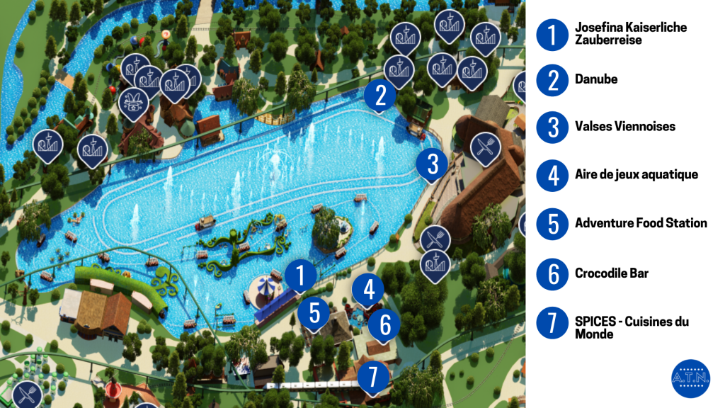 Précisons pour terminer que le reste de l’Univers de l’Aventure n’a pas été modifié cette année. Ainsi, l’aire de jeux aquatiques, le restaurant SPICES – Cuisines du Monde, le fast-food Adventure Food Station, le Crocodile Bar, le bloc sanitaire et le point d’information conserveront cette saison encore le thème de l’Afrique et seront sans doute modifiés dans le cadre de la prochaine phase.