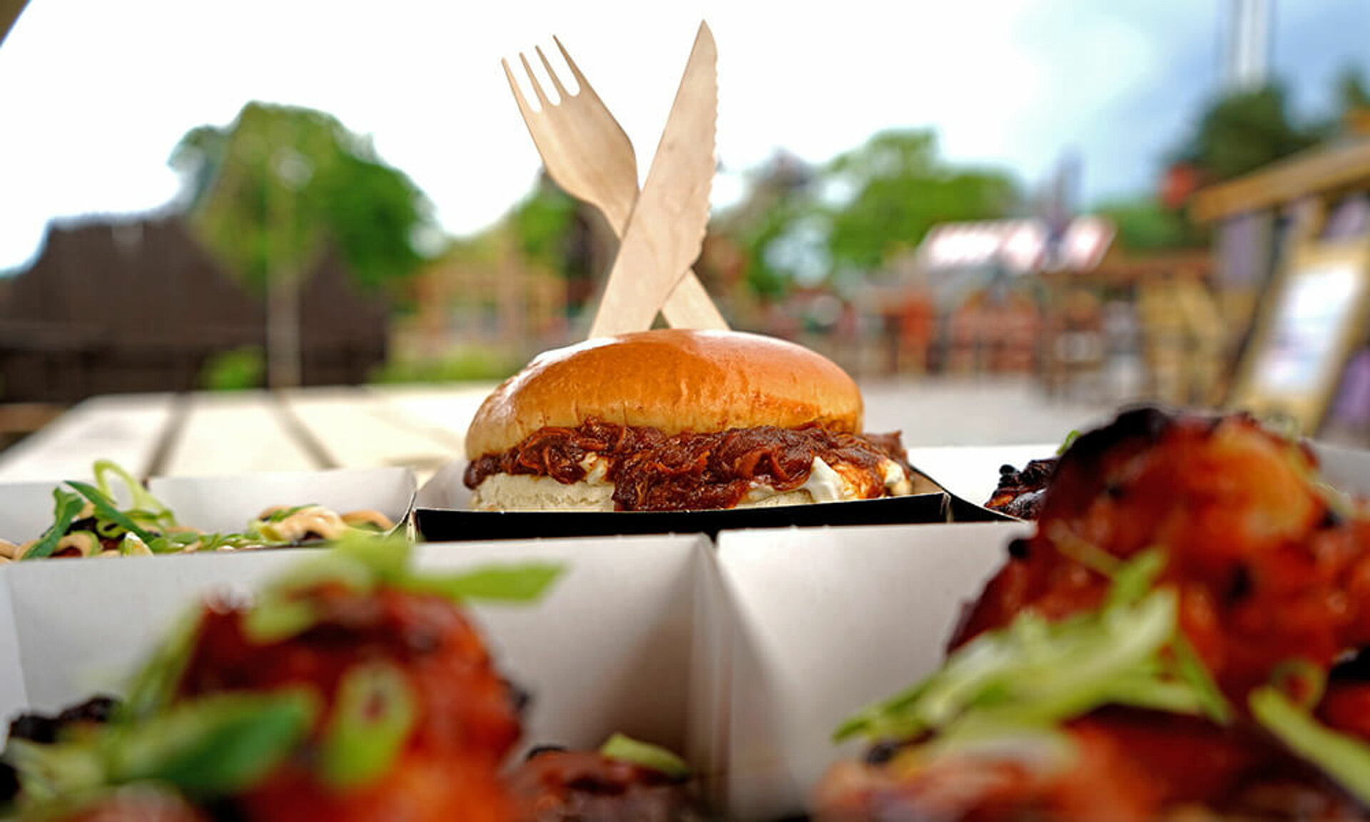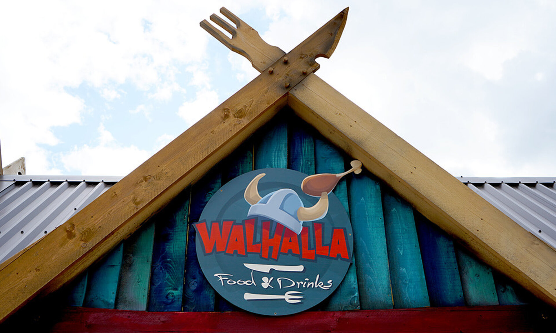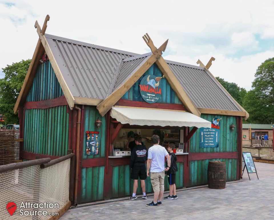 Enfin, la zone Vikings propose un point de restauration nommé Walhalla, un stand qui porte le nom du lieu où sont amenés les valeureux guerriers défunts dans la mythologie nordique. La thématisation rassemble les éléments que l’on attribue aux Vikings, avec, entre-autres, des bancs et tables en bois et de l’acier. Le point sert des spécialités barbecue et les visiteurs peuvent s’installer sur une terrasse surplombant le lac avec une vue sur Adventure Cove. Notons que l’ancien stand de la zone servait des hot-dogs et des glaces et ne portait pas de nom.