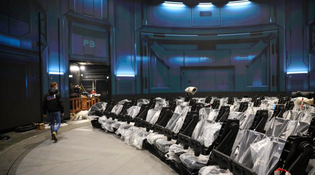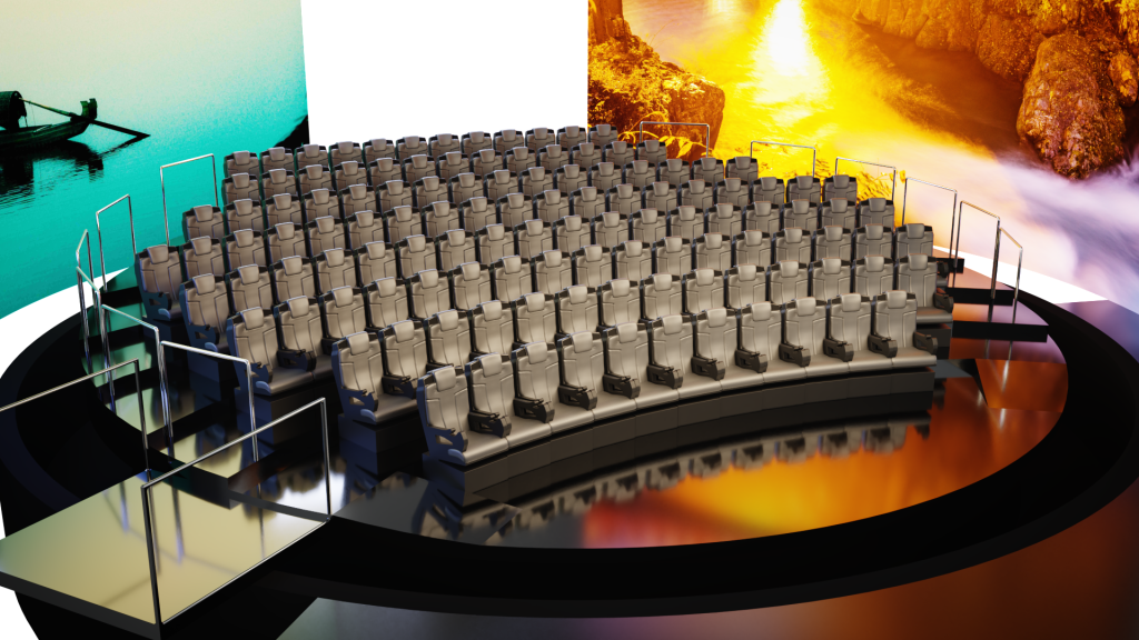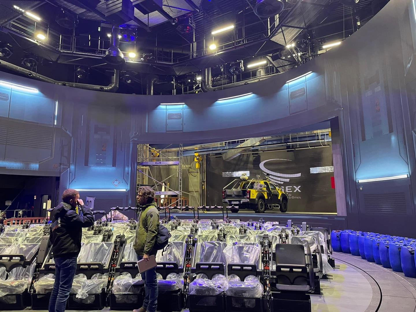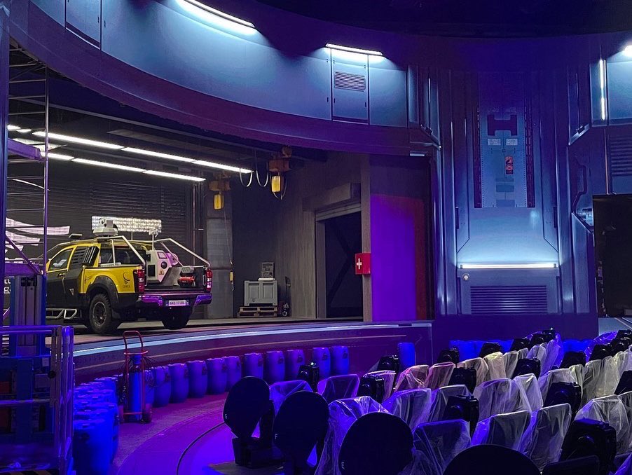 Un théâtre circulaire, immersif et mobile a été construit pour ce spectacle vivant et digital (Dynamic Motion Theater) qui promet une bonne dose d’action. En effet, le théâtre de 120 places est, dans son intégralité, fixé sur des vérins hydrauliques permettant à toute la plateforme de bouger en fonction de l’action : s’incliner, tourner, s’abaisser… à la manière d’un cinéma 4D mais en beaucoup (beaucoup) plus grand. Elle peut atteindre 30 km/h (en tournant) et on doit sa réalisation à Dynamic Attractions, une société canadienne.