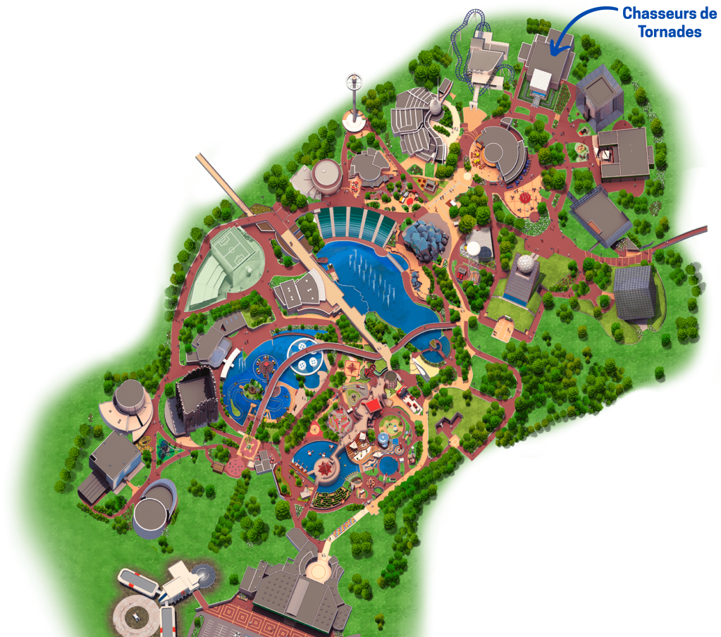 Cette attraction est située dans Images Studio, le pavillon entre Objectif Mars (nouveauté 2020) et Arthur, L’Aventure 4D. Celui-ci a fait l’objet d’une destruction partielle pour y accueillir Chasseurs de Tornades.