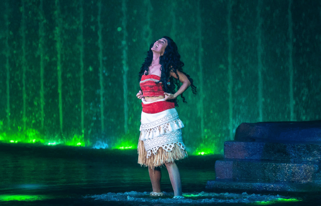 Après un plongeon de la scène dans le noir, une raie manta apparaît sur les écrans d’eau et les éclairages révèlent Vaiana, les pieds dans l’eau, qui chante I Am Moana, accompagnée d’effets d’eau et de lumière. Après son moment, l’écran d’eau enchaîne les scènes de victoire des mêmes dessins animés qu’au début de la séquence.
