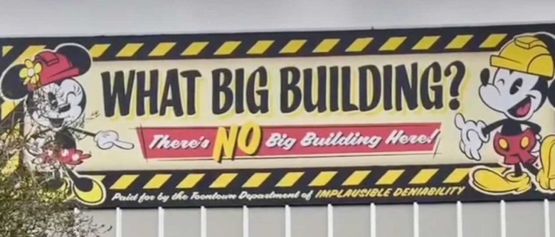 Pour terminer, notons que ce n’est pas sans une bonne dose d’humour que Disney avait anticipé les réactions (négatives) des visiteurs face à cet énorme édifice qui n’avait pas encore été camouflé…