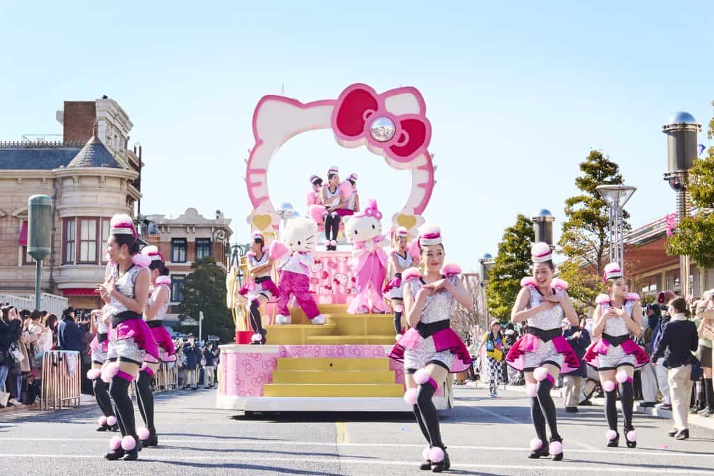 Après le char d’introduction, Hello Kitty et Dear Daniel apparaissent en robe de soirée sur un char tout rose.