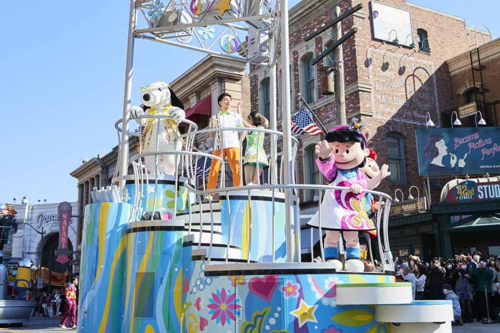 Vient ensuite Charlie Brown, accompagné de Lucy Van Pelt et Snoopy, à bord d’un char multicolore.