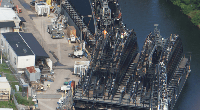 Ce spectacle était lancé depuis ces immenses barges, que vous pouvez voir ci-dessous, en pleine construction en 2020. Elles ont ensuite été positionnées sur le Lagoon en Avril 2021.
