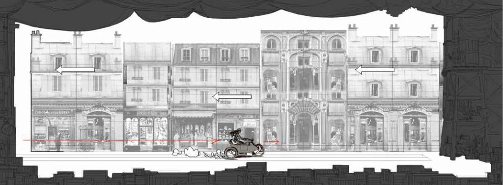 Pour reproduire l’effet du travelling, comme au cinéma (une caméra qui suit une voiture le long d’une rue par exemple), le parc a conçu un décor en mouvement, qui défile devant les spectateurs, pour ainsi créer un travelling inversé. Les nombreuses devantures de magasins, d’un total de 140 tonnes, avec des bâtiments pouvant atteindre 10 mètres de hauteur, constituent une rue de près de 2 km de long. Les 120 personnages du spectacle embarquent dans ce travelling grâce à des tapis roulant disposés devant les devantures.