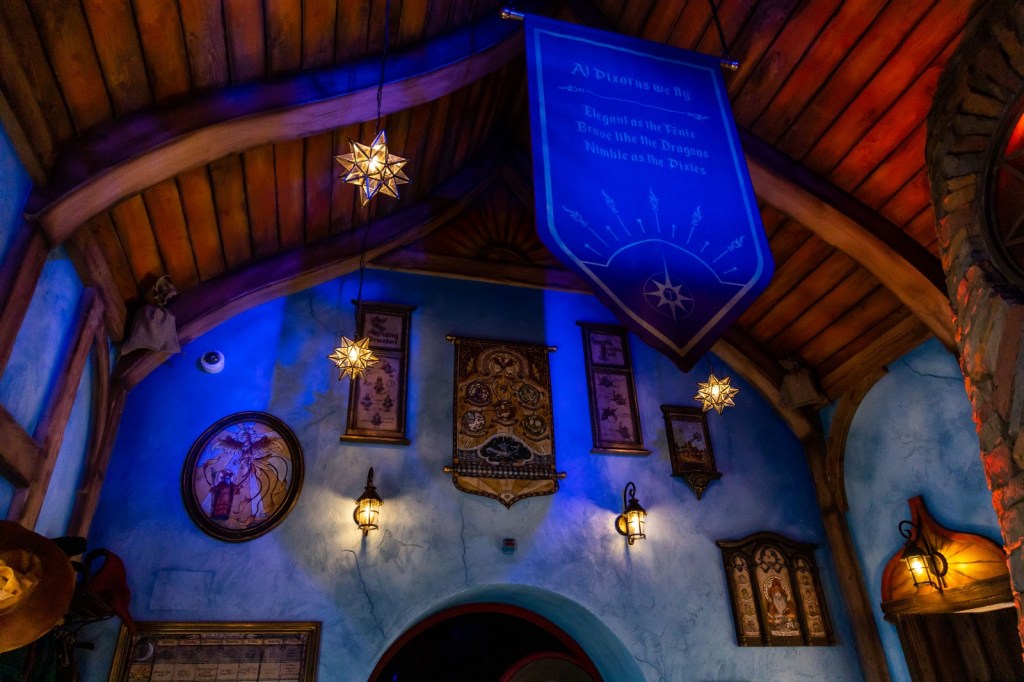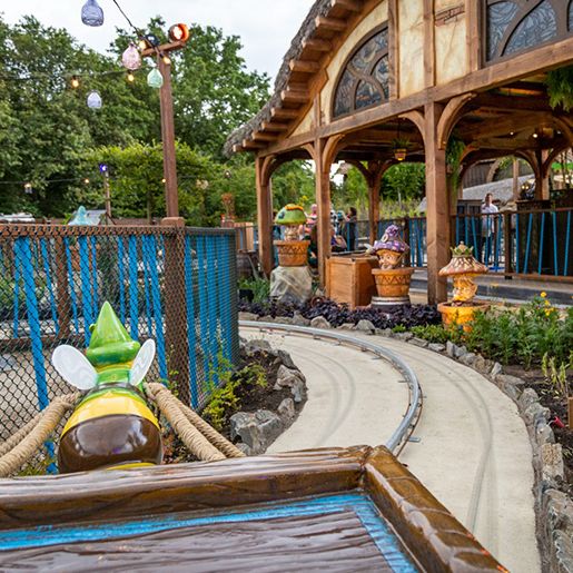 Au fond de la zone, du côté du restaurant The Flaming Feather, Merlin propose aux plus petits de visiter son jardin d’herbes magiques ! Assis dans un charriot tiré par une abeille, ils peuvent admirer des fleurs multicolores, des plantes peu communes et des animaux fantaisistes dans des décors colorés.