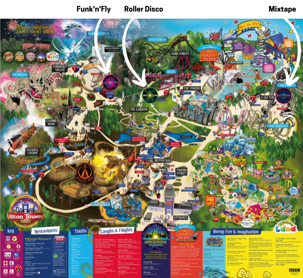 Ces additions ont été un bon coup marketing pour Alton Towers car le parc a su inventer une communication très originale pour l’arrivée de ces flat rides ! Rappelons qu‘en 2021, une zone thématique a fait son apparition dans le parc, basé sur les histoires des livres pour enfants d’un auteur anglais, The World of David Walliams.