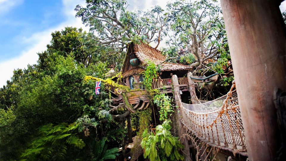 C’est le 18 Novembre 1962 qu’ouvre à Adventureland l’attraction Swiss Family Treehouse, un parcours pédestre basé sur le film Disney Les Robinsons des mers du Sud (Swiss Family Robinson, en anglais) sorti en 1960. L’aventure fut ensuite rethématisée sur la licence Disney Tarzan en 1999, l’année même de sortie du 59e long-métrage d’animation Disney. Signalons au passage qu’il existe quatre autres versions de ce walktrought dans quatre parcs Disney différents : Swiss Family Treehouse à Magic Kingdom, ouvert en 1971, La Cabane des Robinson au Disneyland Park (Paris), ouvert en 1992, Swiss Family Treehouse à Tokyo Disneyland, ouvert en 1993, et Tarzan’s Treehouse à Hong Kong Disneyland, ouvert en 2005.