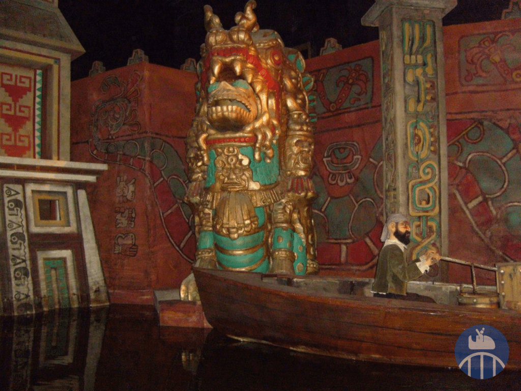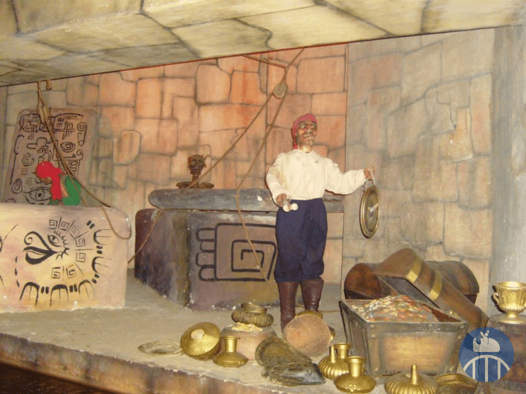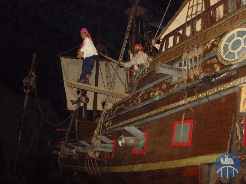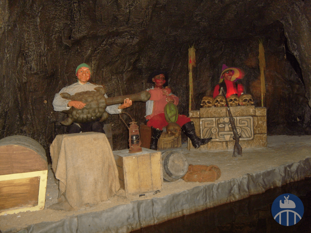 Après une première scène représentant le gouverneur Diego Hernandez de Oro et John Speedy attablés au même niveau que le quai d’embarquement, le bateau s’élance, sur une bande-son iconique, dans une petite chute d’un peu plus de trois mètres qui le fait redescendre au niveau du sol. Différents tableaux s’enchainent alors selon la storyline évoquée plus haut : l’orage, l’attaque de Cablo Real, le pillage des trésors des Mayas, les idoles mayas crachant du feu, le stratagème des fantômes, le combat naval des pirates face au fort espagnol, les musiciens mayas fêtant le départ des pirates et le squelette.