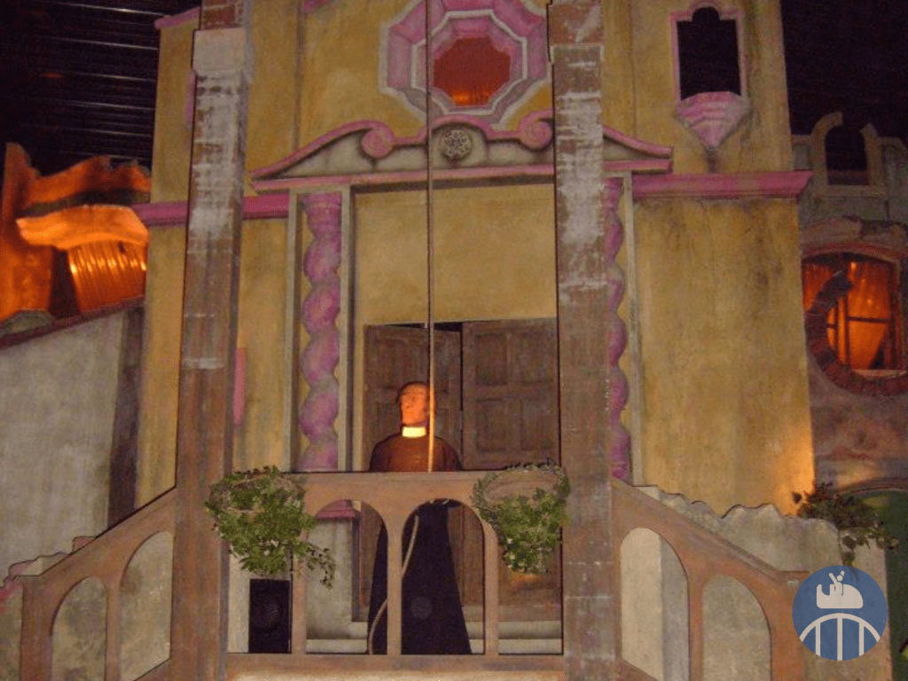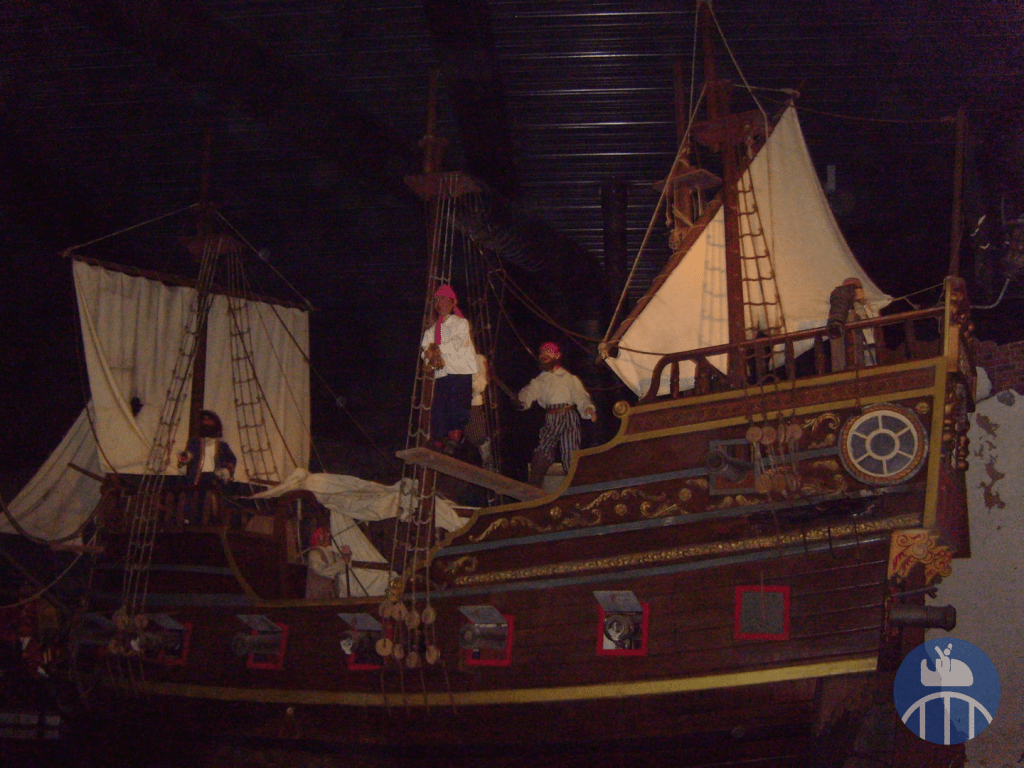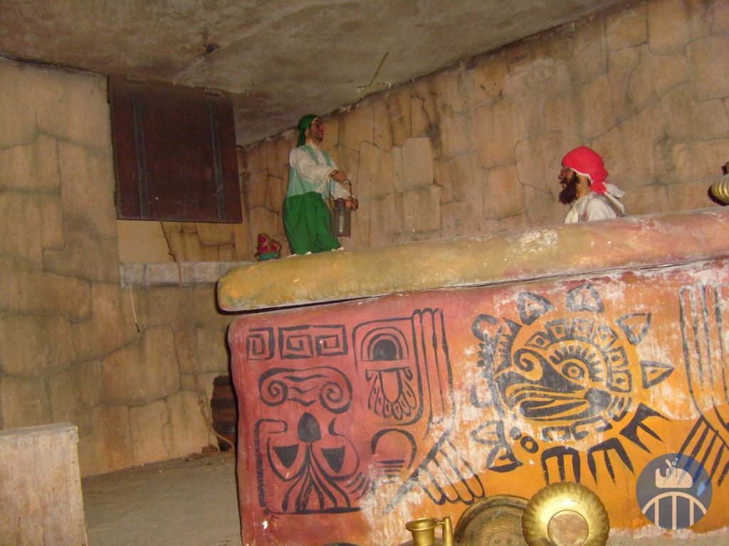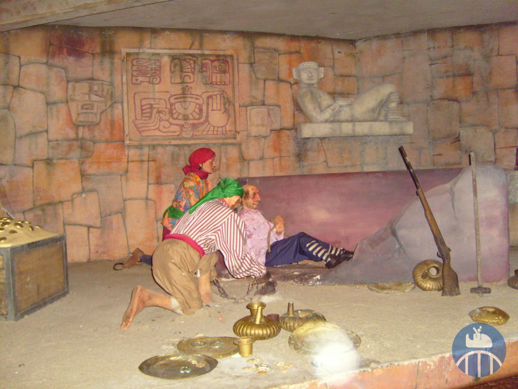 Après une première scène représentant le gouverneur Diego Hernandez de Oro et John Speedy attablés au même niveau que le quai d’embarquement, le bateau s’élance, sur une bande-son iconique, dans une petite chute d’un peu plus de trois mètres qui le fait redescendre au niveau du sol. Différents tableaux s’enchainent alors selon la storyline évoquée plus haut : l’orage, l’attaque de Cablo Real, le pillage des trésors des Mayas, les idoles mayas crachant du feu, le stratagème des fantômes, le combat naval des pirates face au fort espagnol, les musiciens mayas fêtant le départ des pirates et le squelette.