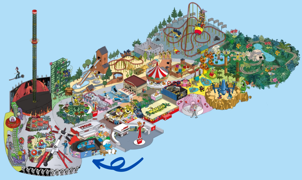 Depuis le 6 Avril 2024, le Parc Spirou accueille de nouveaux personnages de BD pour une nouvelle aventure virtuelle « en exclusivité mondiale » : Les Schtroumpfs et le Grimoire Magique ! Venez aider les bonshommes bleus de Peyo à échapper à l’infâme Gargamel !