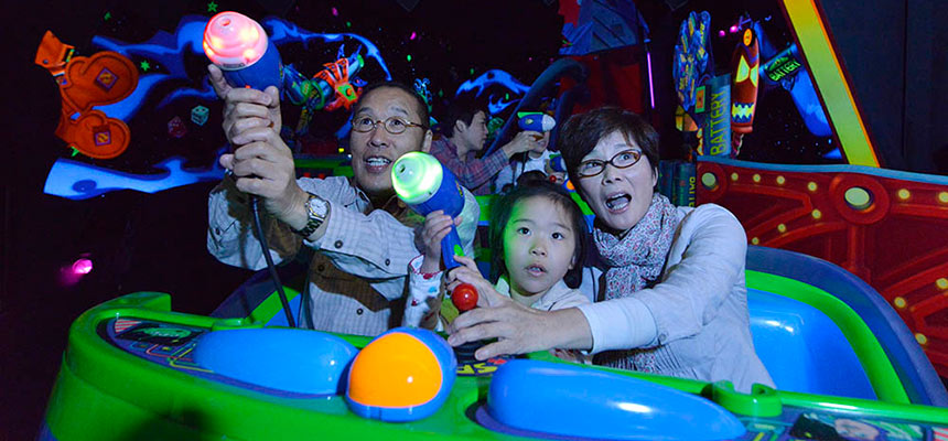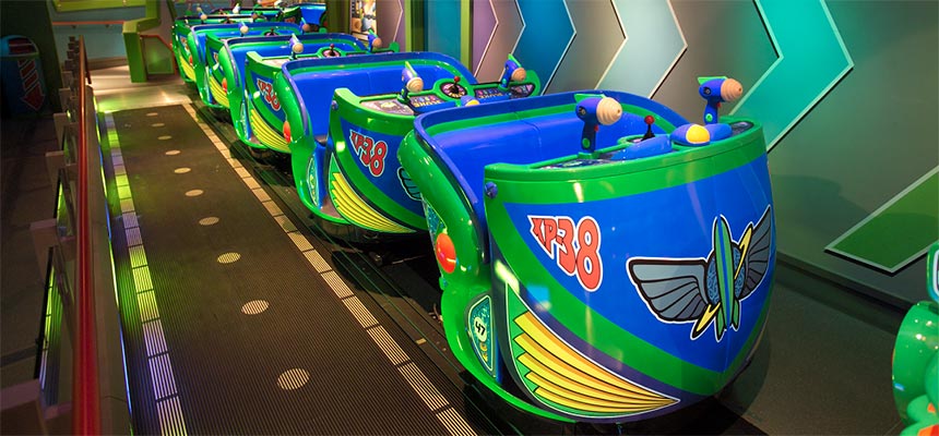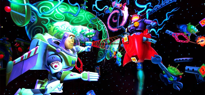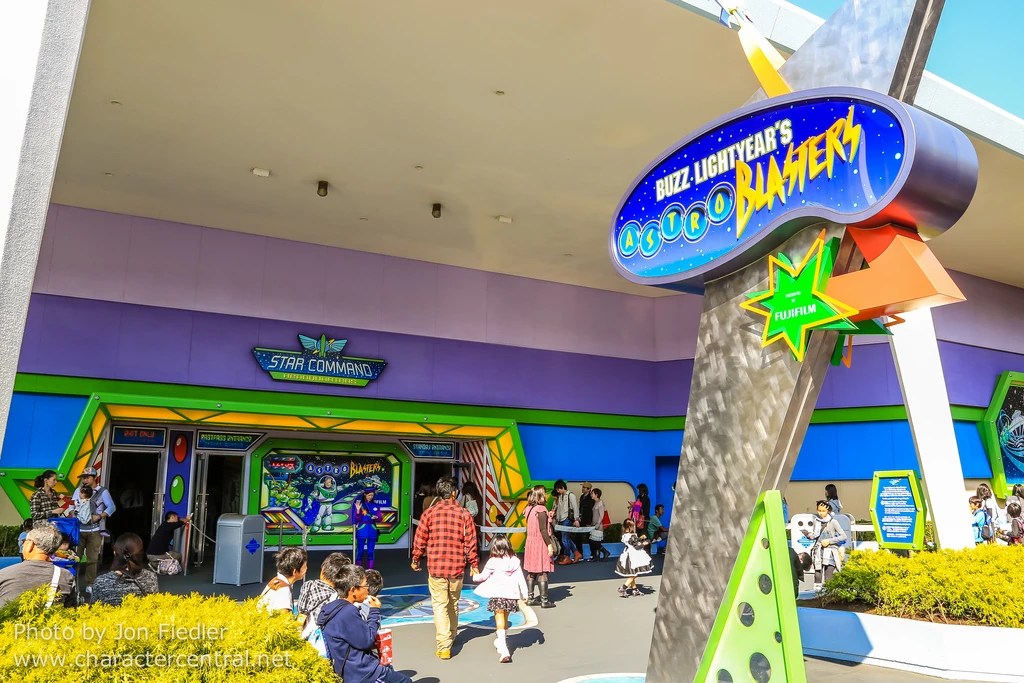 Buzz Lightyear’s Astro Blasters se situe dans la zone Tomorrowland du parc, prenant la partie droite de la rue principale lorsque vous y rentrez par la place du château. Ouverte en avril 2004, il s’agit d’un dark ride interactif sur l’univers de Buzz l’Éclair, personnage du Pixar Toy Story. Précisons qu’il s’agissait de la deuxième mouture de cette célèbre attraction des parcs Disney (après Magic Kingdom en 1998) et qu’elle a apporté un grand nombre de nouveautés pour les prochaines itérations de l’attraction, comme par exemple le fait que les pistolets ne soient pas fixés sur le véhicule et qu’il y ait des cibles rapportant plusieurs points. Notons qu’une boutique souvenirs se situe à la sortie de l’attraction, Planet M.