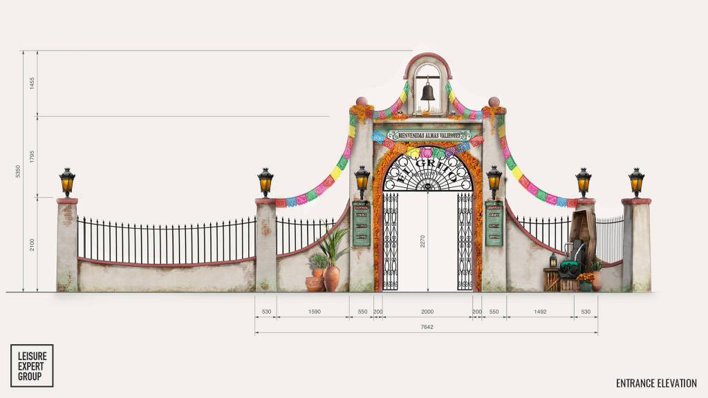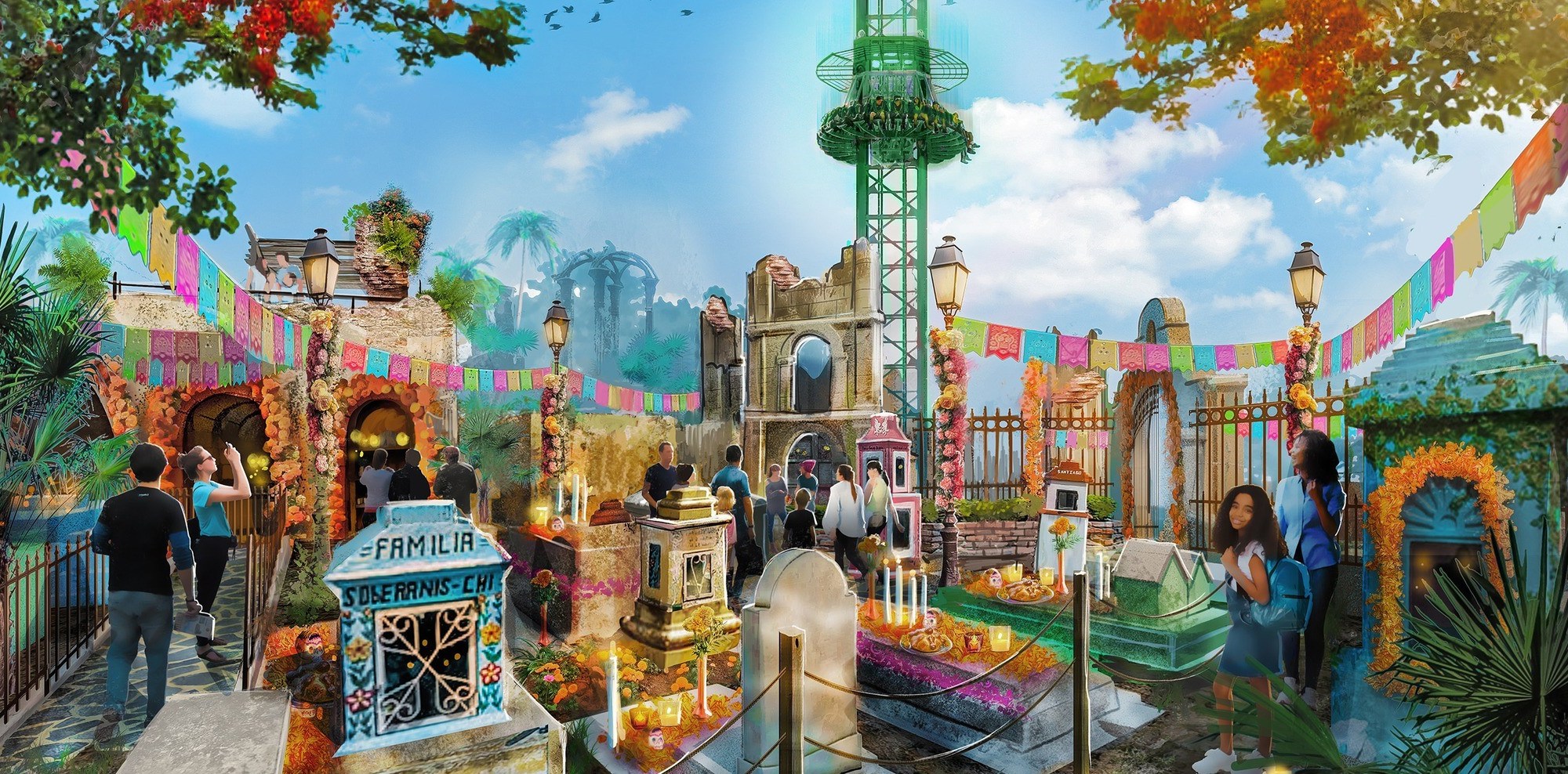 La thématique choisie est l’univers du Día de los Muertos et l’attraction trône d’ailleurs au cœur d’un cimetière mexicain. Précisons que la thématisation a été confiée à l’entreprise de talent Leisure Expert Group.