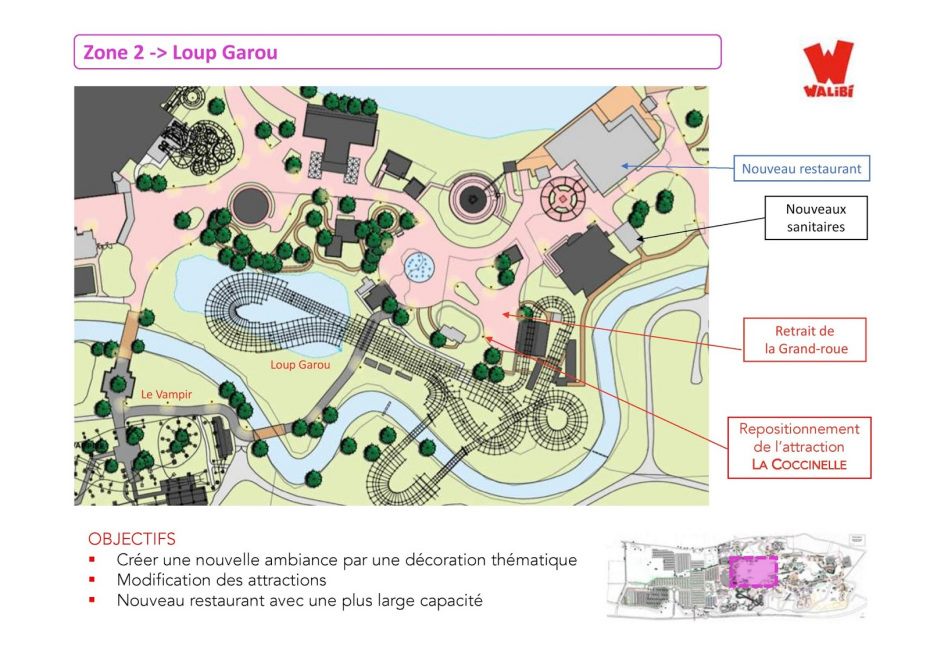 Le World aura droit à un nouveau restaurant pouvant accueillir plus de visiteurs (en lieu et place de l’actuel Pizza Solo), mais aussi à de nouveaux sanitaires. De plus, une nouvelle voirie reliera le Vampire (situé actuellement dans un cul-de-sac) au Loup Garou.