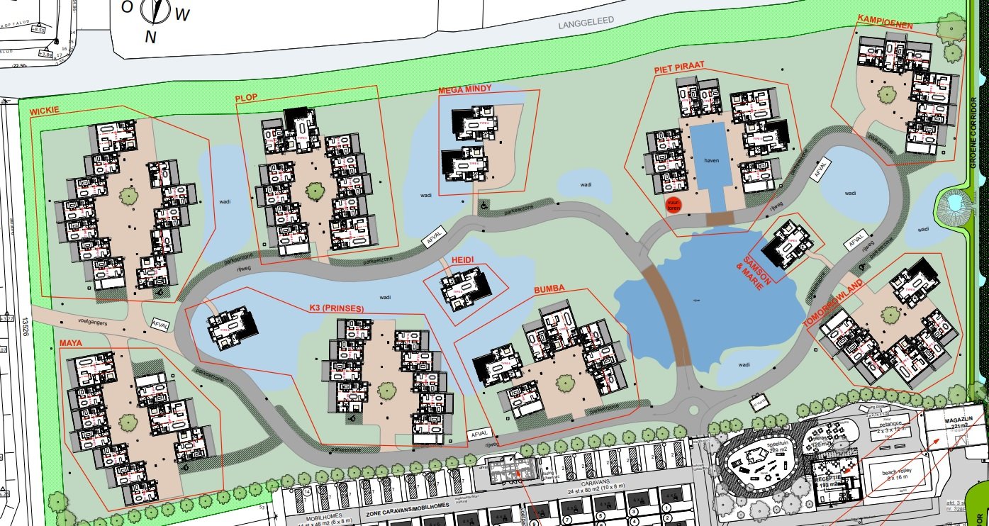 Les personnages du Studio 100 devaient initialement être de la partie, avec Vic le Viking, Bumba, Pat le Pirate, Mega Mindy, Heidi, Samson & Marie, Maya et Plop, mais aussi d’autres thèmes comme Tomorrowland, FC De Kampionen ou les K3 (Princes). Les maisons de vacances devaient ainsi être regroupées en petites zones arborant chacune un thème tiré d’une des licences du studio flamand.