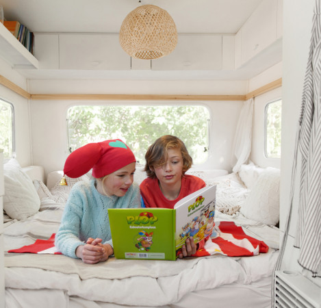 Enfin, la Caravane Samson & Marie, pour 4 personnes, propose deux lits jumeaux et un lit superposé, les hôtes devant utiliser les installations sanitaires communes.