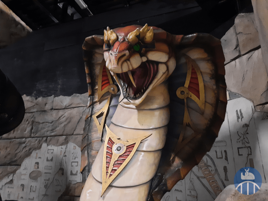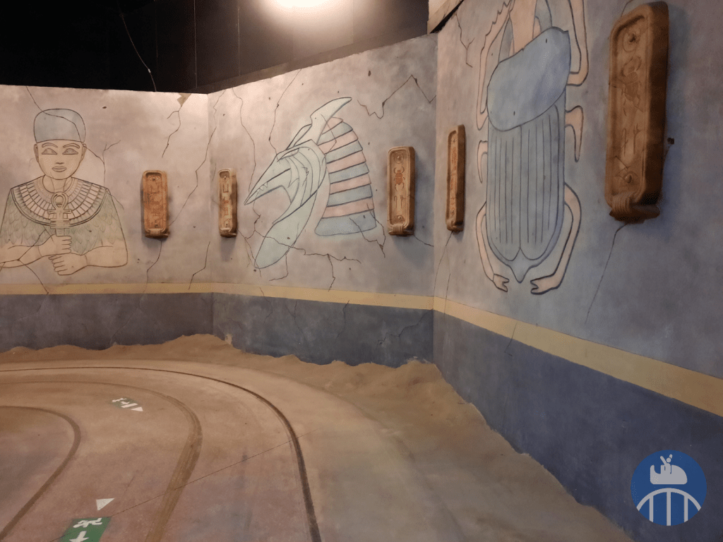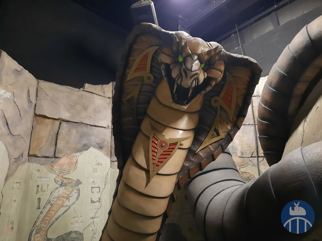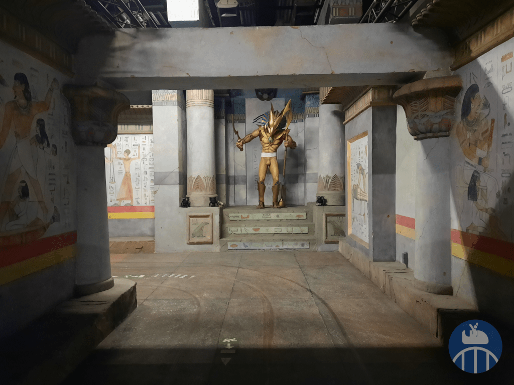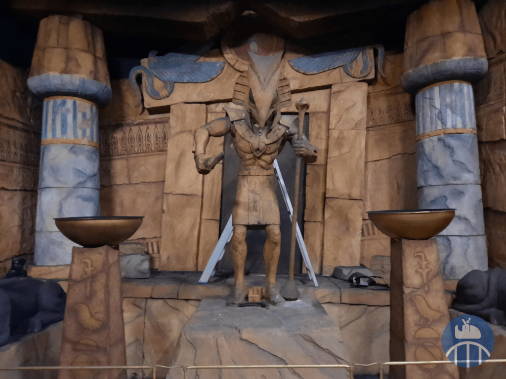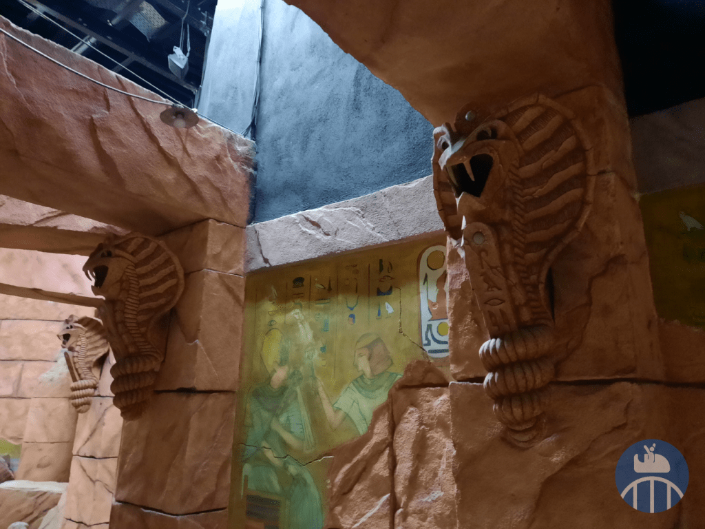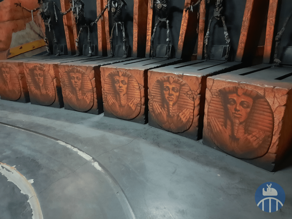 Après l’embarquement (chaque véhicule se compose de deux rangées de trois places), les visiteurs commenceront leurs incroyables aventures en passant devant des bustes de cobras, traverseront le chantier archéologique en cours, verront se transformer en squelette une archéologue, puis seront toisés par une statue colossale de Seth.