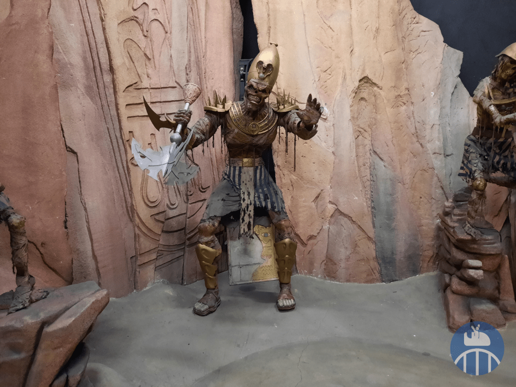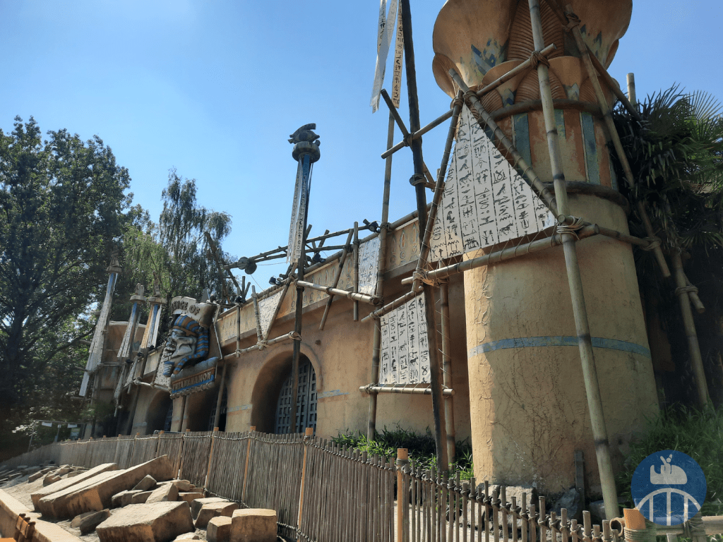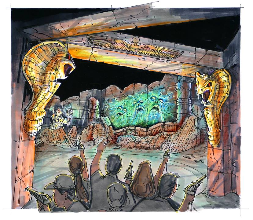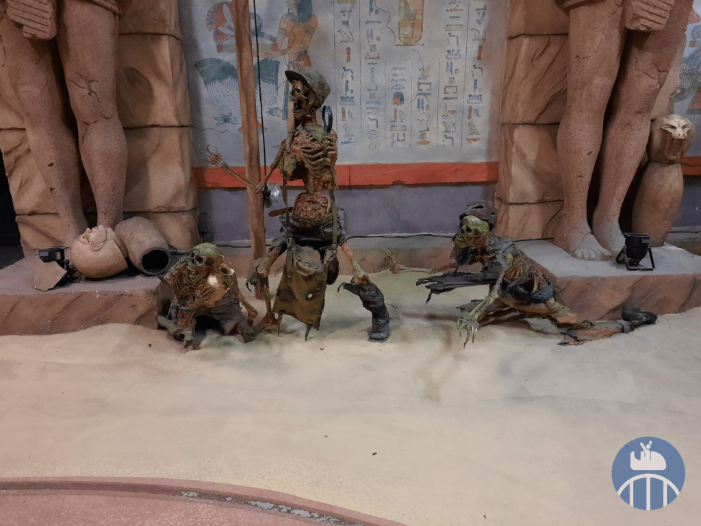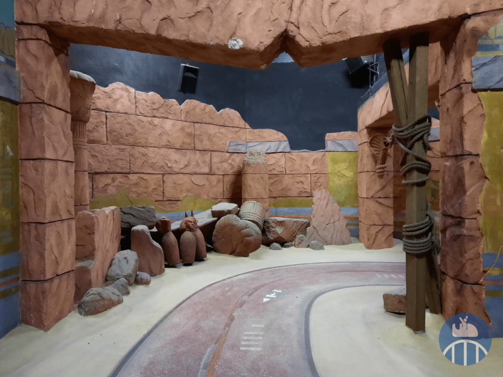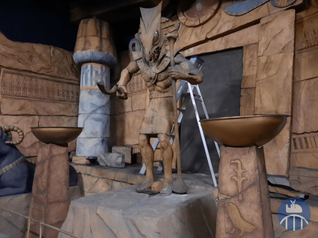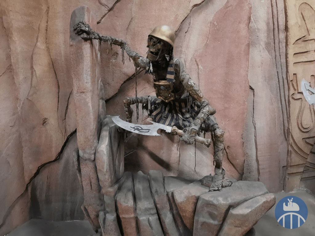 Après l’embarquement (chaque véhicule se compose de deux rangées de trois places), les visiteurs commenceront leurs incroyables aventures en passant devant des bustes de cobras, traverseront le chantier archéologique en cours, verront se transformer en squelette une archéologue, puis seront toisés par une statue colossale de Seth.