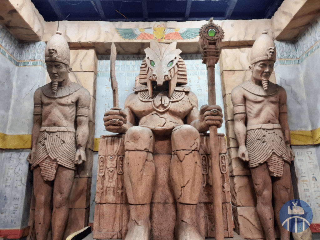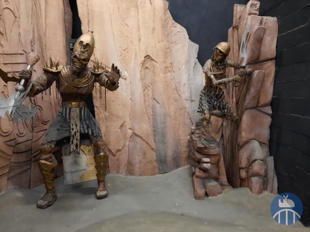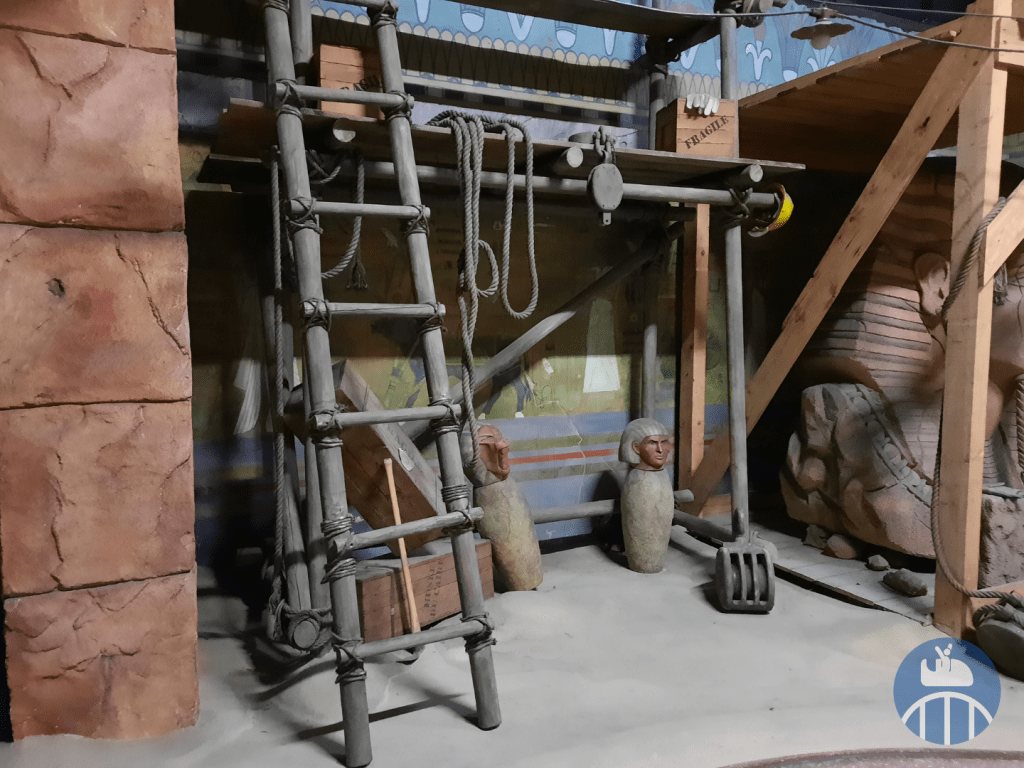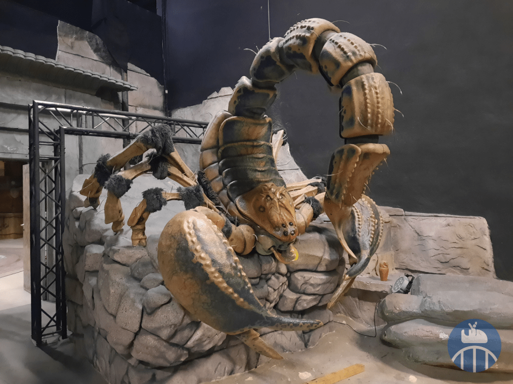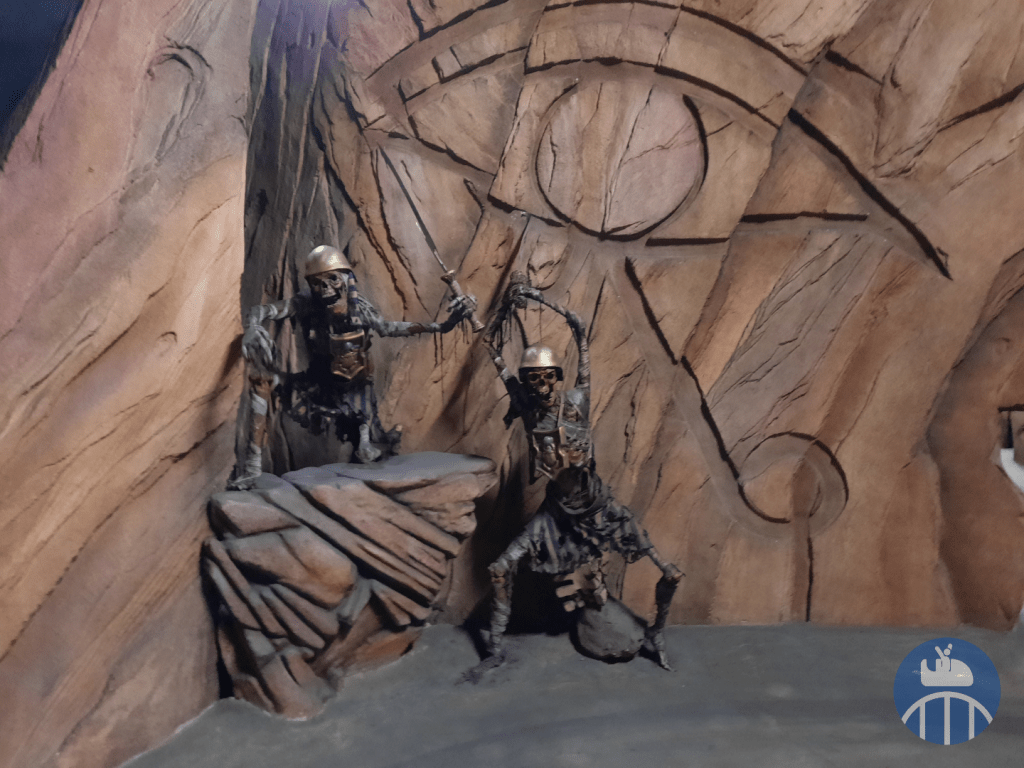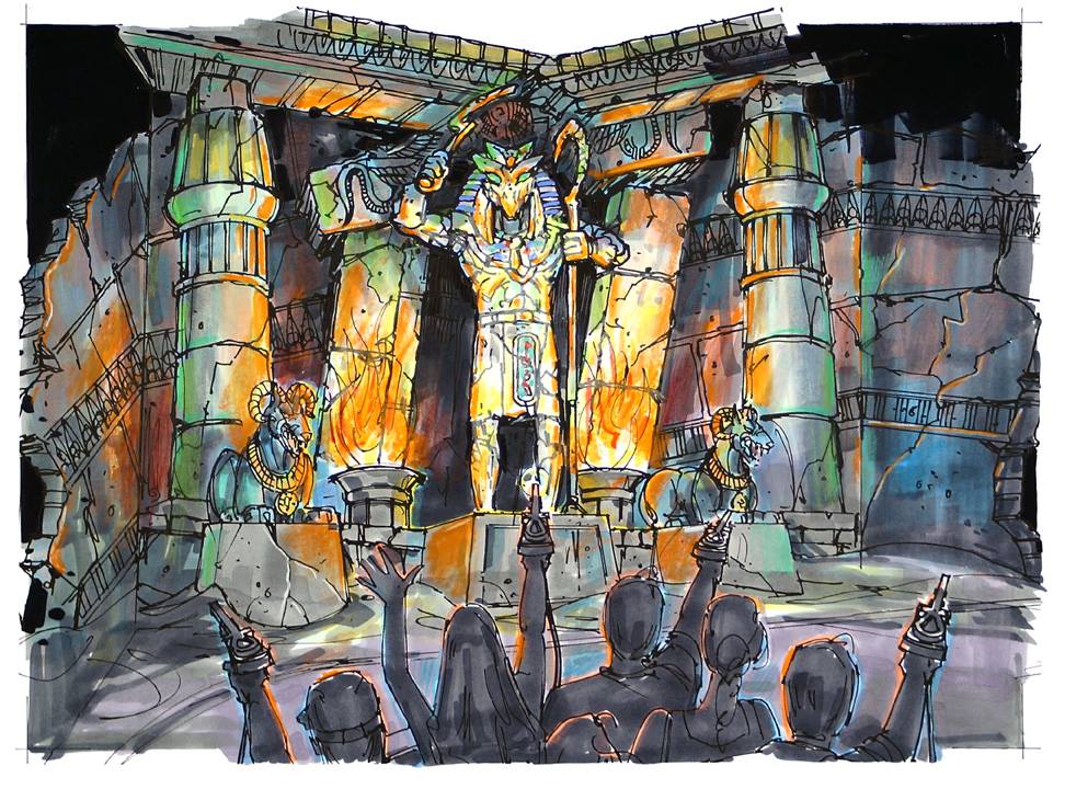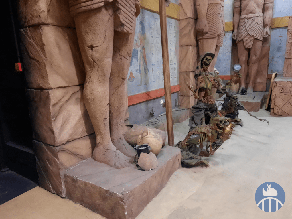 Après l’embarquement (chaque véhicule se compose de deux rangées de trois places), les visiteurs commenceront leurs incroyables aventures en passant devant des bustes de cobras, traverseront le chantier archéologique en cours, verront se transformer en squelette une archéologue, puis seront toisés par une statue colossale de Seth.