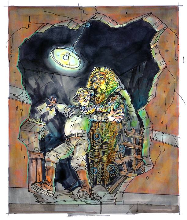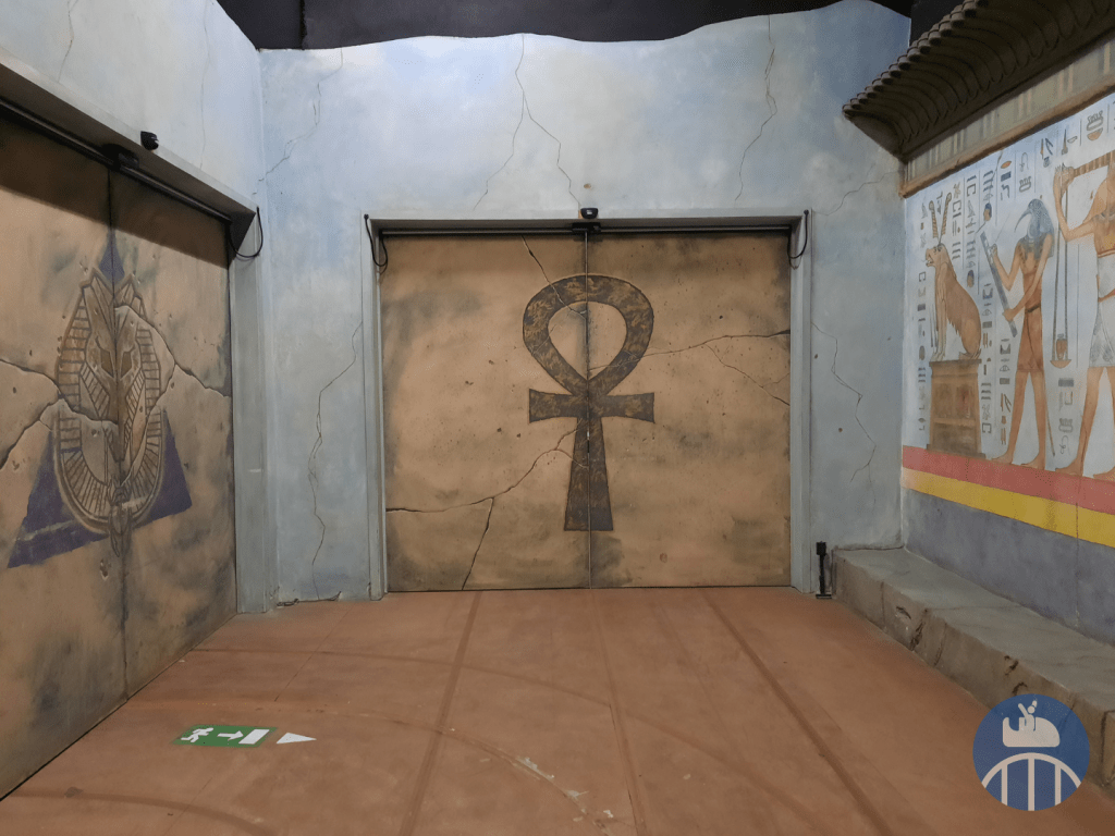 Dans la file d’attente, deux scènes servent d’introduction à l’aventure. Dans la première, l’archéologue Xavier Gaudet vous présente votre mission : récupérer le trésor de Toutankhamon, rien que ça ! Dans la deuxième, et c’est nettement moins enthousiasmant, le prophète Nazeer vous avertit : le dieu de la Destruction et du Chaos, Seth, a lancé une terrible malédiction afin de protéger le tombeau du célèbre pharaon ! Il faudra donc user de l’Ankhinator, un pistolet-laser en forme d’Ânkh (signe de vie en Égypte ancienne), pour pouvoir espérer échapper aux forces mystiques !