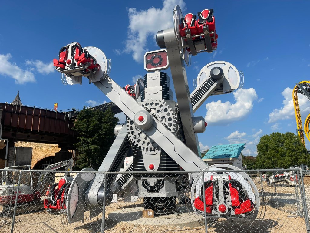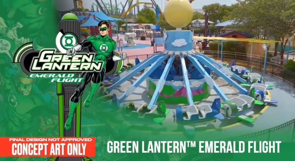 Il s’agit d’un Nebulaz, véritable succès commercial de l’entreprise italienne Zamperla puisqu’il s’en construit un peu partout ces derniers temps, notamment à Walibi Rhône-Alpes (premier modèle en Europe !), au Parc Astérix, à Drayton Manor, à Liseberg ou encore à Bellewaerde Park. Celui-ci a pris place à côté de Stunt Pilots (qui est devenu GREEN LANTERN Emerald Flight, vous suivez ?) en remplaçant S.S. Overboard Play Zone, une aire de jeux.