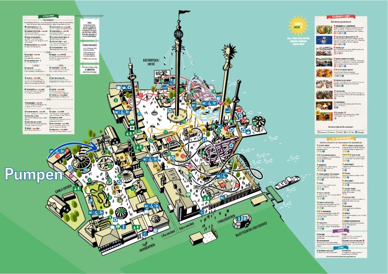 Pumpen se situe dans la zone Lilla Området (la Petite Zone du parc), à la place de la Lilla Pariserhjulet (Petite Grande Roue), ouverte en 1931 et qui a changé plusieurs fois de place depuis (elle sera sûrement réinstallée quelque part dans le parc). Elle a été construite par W.F. Mangels Company, l’un des tout premiers inventeurs d’attractions aux États-Unis, qui a notamment construit le fameux The Whip à Coney Island (New York).