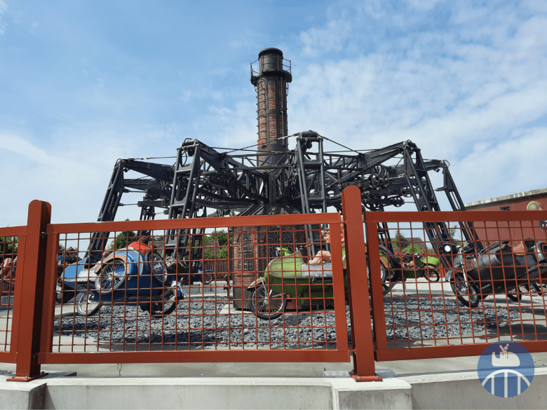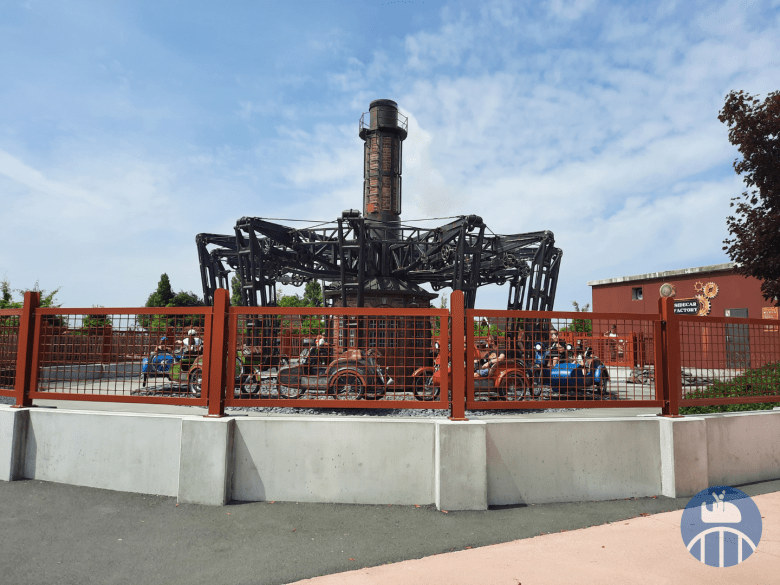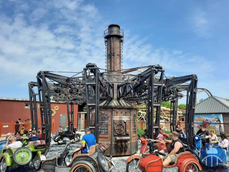 Deux attractions composent cette nouvelle zone, la première étant déjà en activité depuis… Juillet 2023 ! Celle-ci, se nommant Sidecar Factory, est de type Sidecar XL et provient du catalogue du constructeur Technical Park. À bord de l’une des 12 embarcations biplaces tournoyant autour d’un axe central, les visiteurs ont la possibilité de s’incliner jusqu’à 90° ! Notons que des attractions de ce type fleurissent un peu partout ces derniers temps : ainsi, Fraispertuis-City, Liseberg ou encore tout récemment Walibi Belgium l’ont ajoutée à leur propre offre.