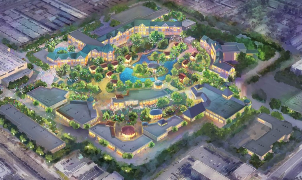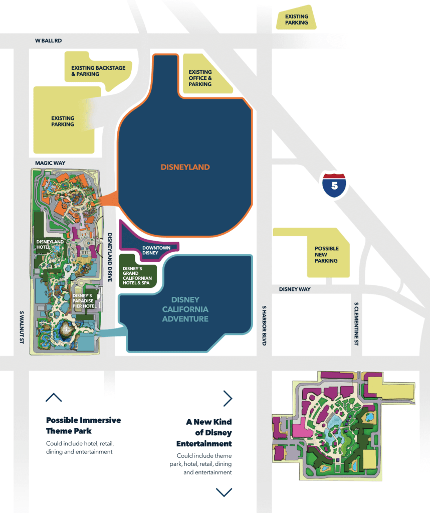 Si les idées ne manquent pas chez Disney, c’est la place qui fait défaut en Californie. En effet, le Resort est coincé dans la ville d’Anaheim tant celle-ci s’est développée (grâce à Disney et aux touristes que le site y fait venir en masse !) et il n’est pas simple d’étendre le site. En outre, des accords liant Disney et les autorités d’Anaheim datant de 1990 limitent encore les perspectives : ceux-ci cloisonnent en effet les différentes parties du Resort, ne permettant pas, par exemple, de construire des attractions dans les zones dédiées à l’hôtellerie. C’était justement ces accords qui étaient en pourparlers afin de les renégocier et c’est à cette occasion que les concepts ont été dévoilés le 25 Mars 2021. Ce n’est pourtant que le 7 Mai 2024 que le conseil municipal d’Anaheim a donné son approbation finale !