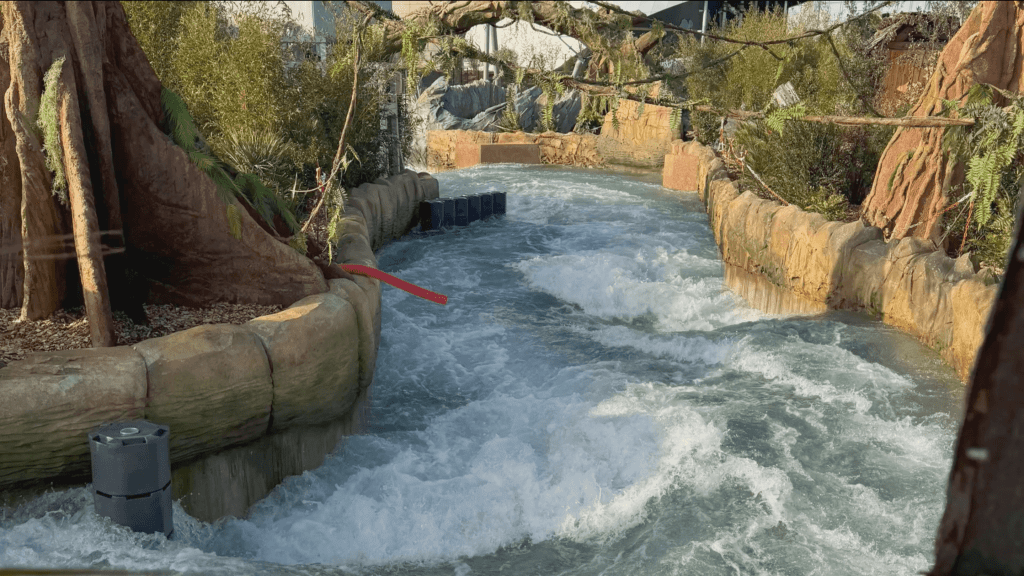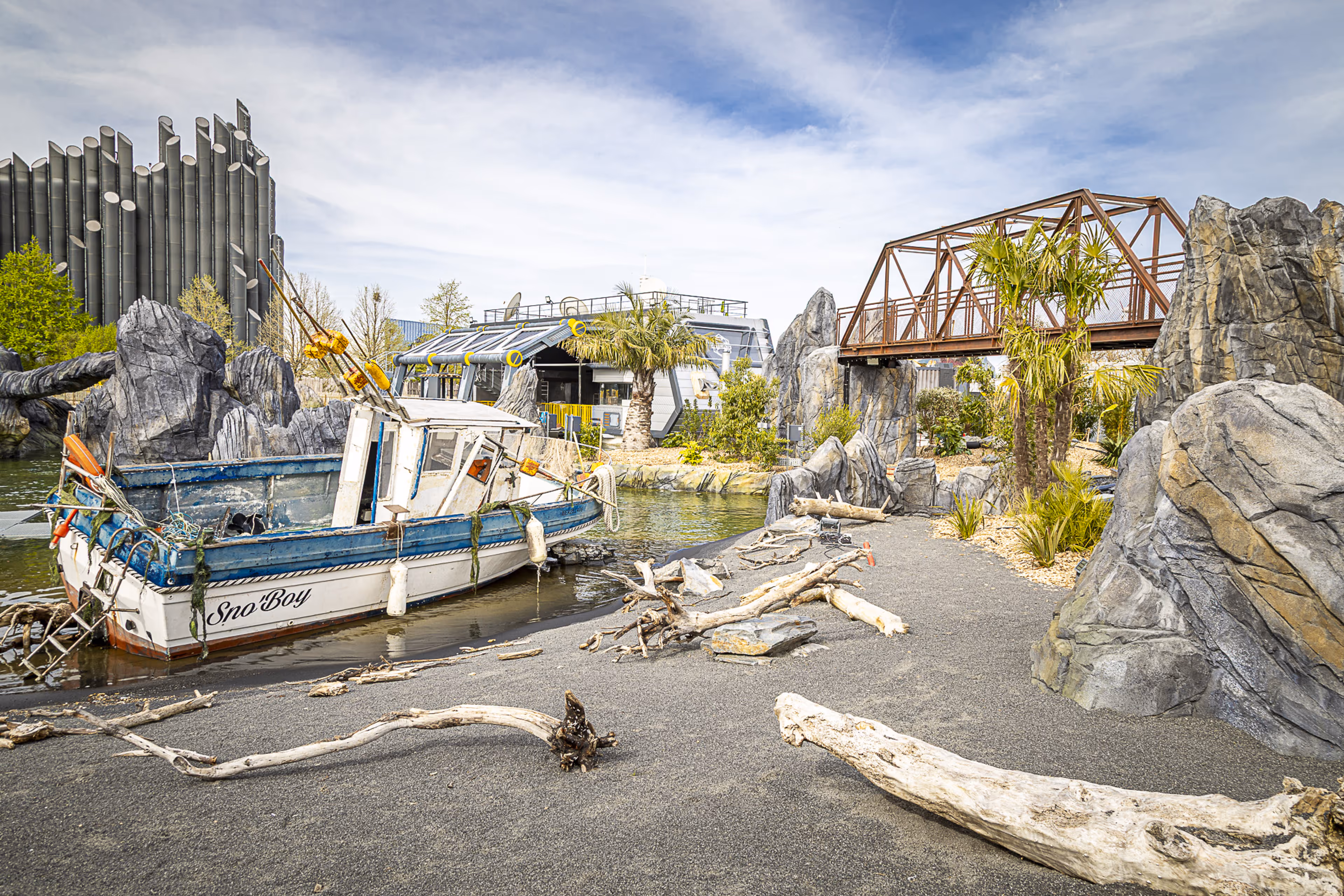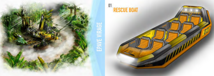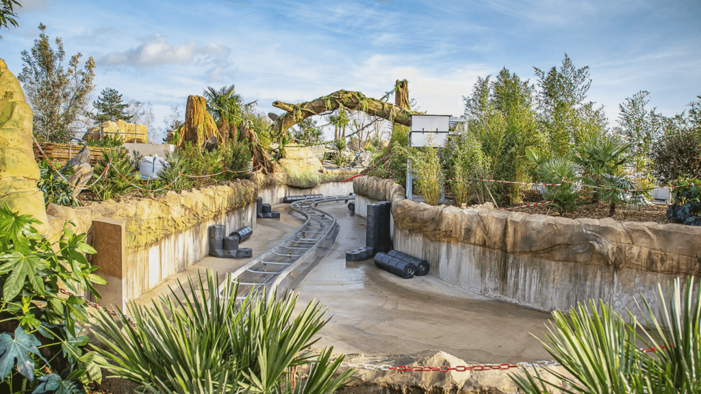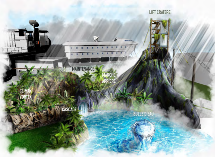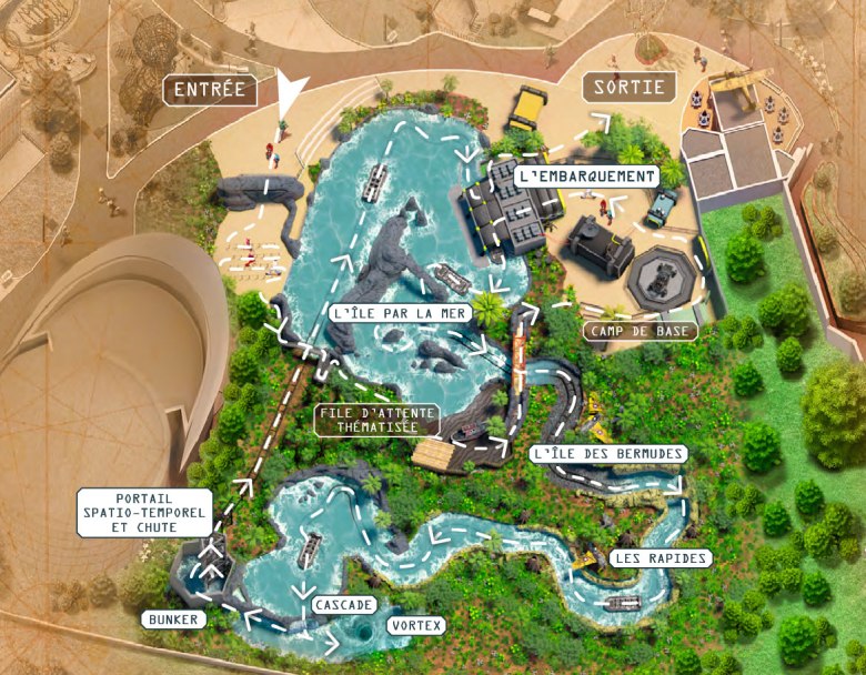 Le parcours, d’une longueur de 457 mètres, est immersif avec notamment une étendue d’eau, des rochers, une plage, une jungle, des rapides et un crash d’avion.