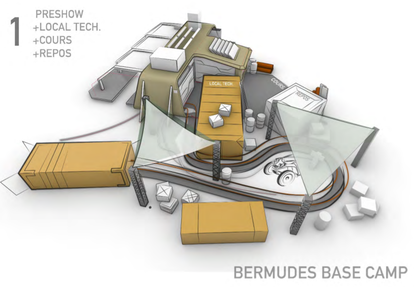 Avant de monter dans les bateaux, les visiteurs entrent dans le camp de base (faisant office de file d’attente) et passent, tout d’abord, dans le laboratoire d’expérimentations scientifiques rempli de dispositifs étranges renfermant les échantillons prélevés dans les Bermudes ainsi que des pyramides de verre remplies de fluide mystérieux…puis enchaînent avec le garage à buggys où attendent les machines d’expédition des explorateurs.