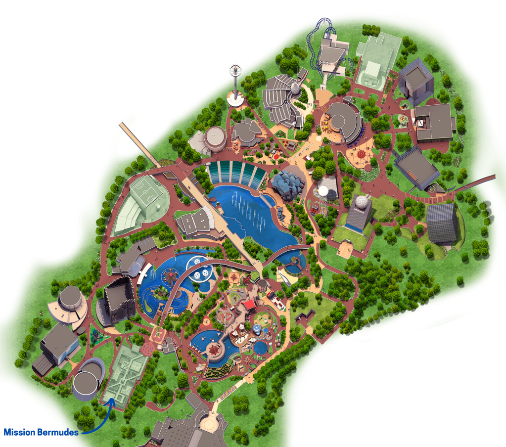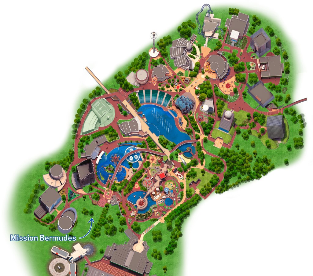 Mission Bermudes est située vers l’entrée du parc, remplaçant Le Jardin des Énergies et une aire de pique-nique, localisés juste à côté de La Machine à Voyager dans le Temps.