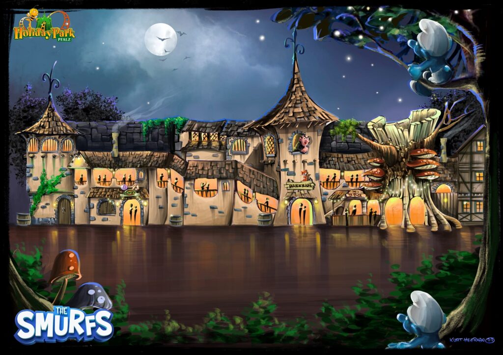Après avoir été intégrés à Plopsa Coo avec la rethématisation du coaster Halvar The Ride en Le Schtroumpfeur, les petits bonshommes bleus de Peyo envahiront bientôt Plopsaland Deutschland (anciennement Holiday Park), un parc appartenant également, faut-il le rappeler, au Groupe Plopsa ! Depuis le 28 Juin 2025 (d’abord annoncé pour 2024, le projet a été reporté d’un an), les Schtroumpfs sont en effet les vedettes d’une toute nouvelle aventure qui a pris la place du dark ride Burg Falkenstein, celui-ci ayant définitivement fermé ses portes le 1er Novembre 2022.